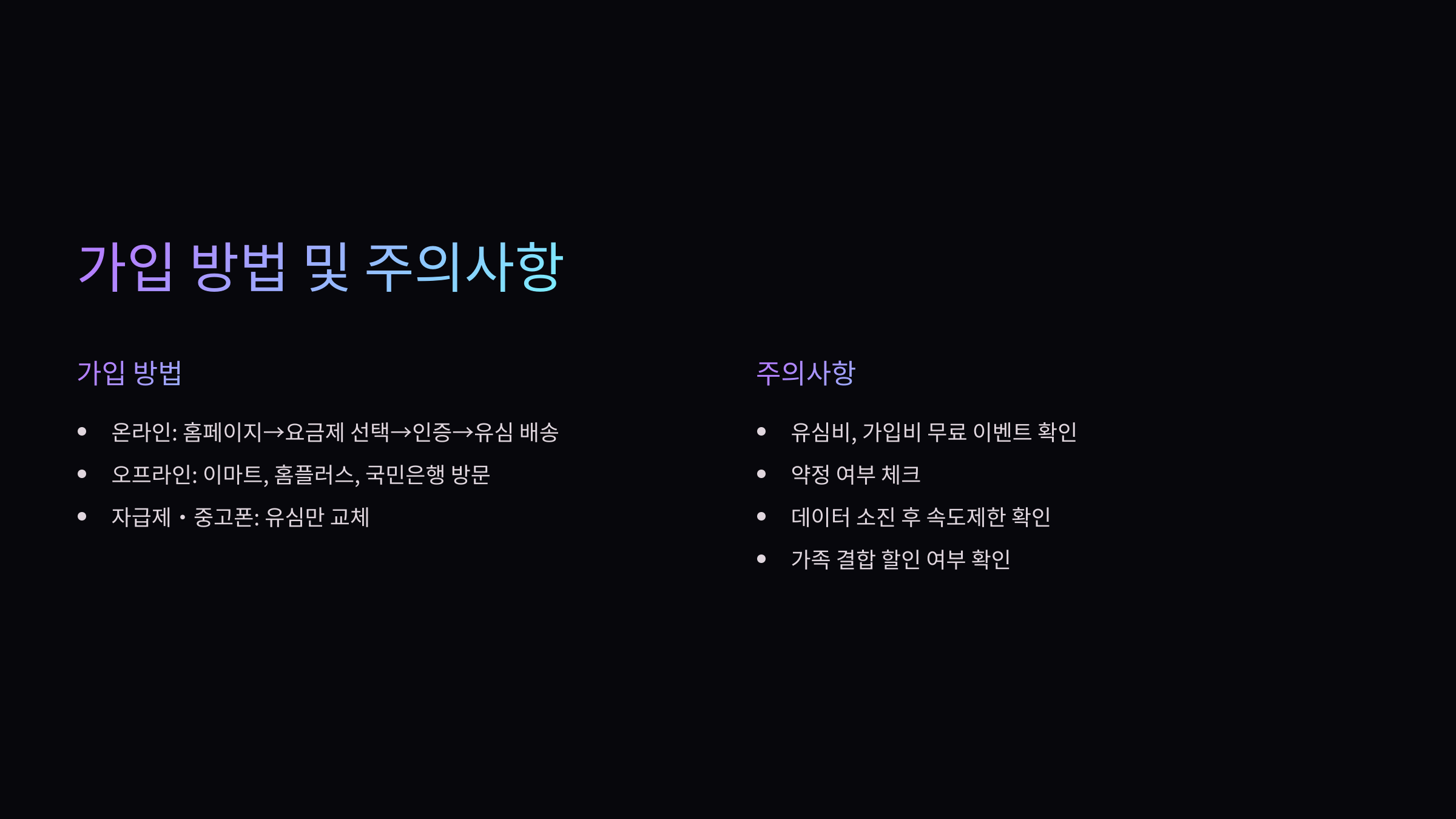 ✅ 온라인 가입: 홈페이지나 비교 사이트 → 요금제 선택 → 본인 인증 → 유심 배송 → 셀프 개통
