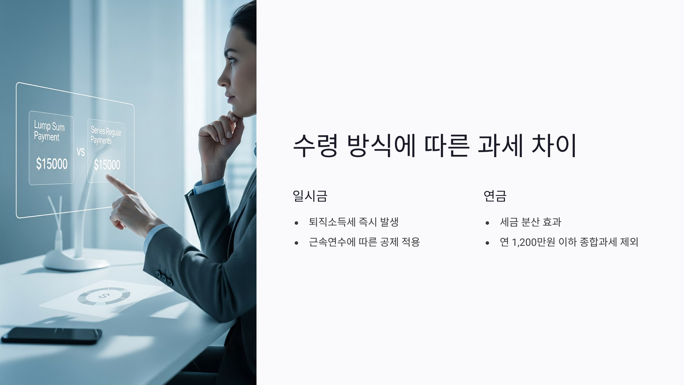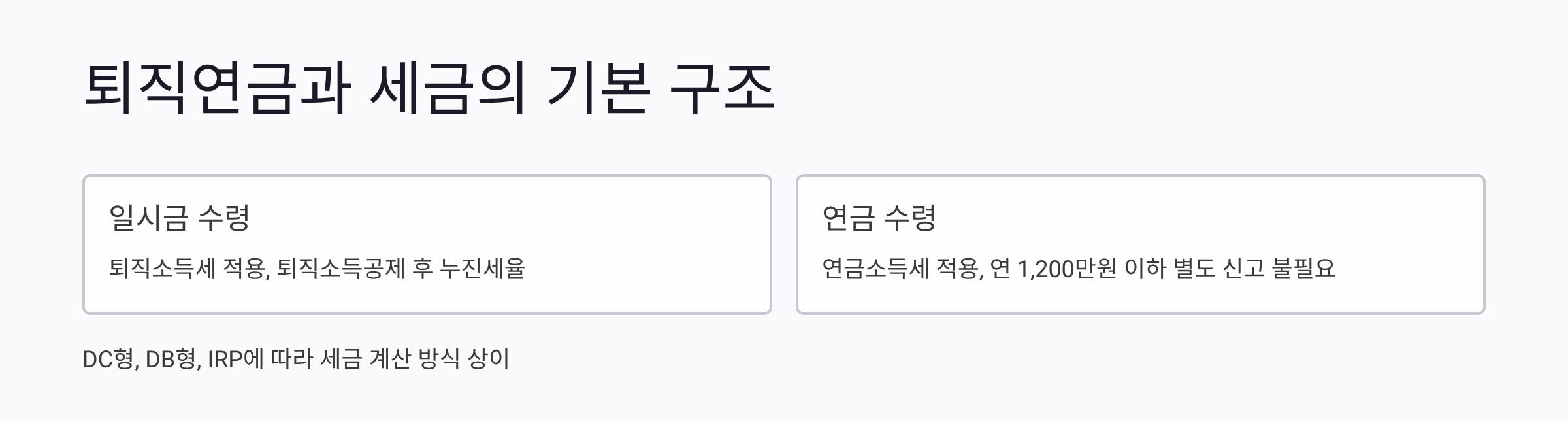 첫 번째는 퇴직할 때 일시금으로 받을 경우, 두 번째는 연금 형태로 나눠서 받을 경우죠. 이 두 방식에 따라 세금이 붙는 기준과 금액이 완전히 달라져요.