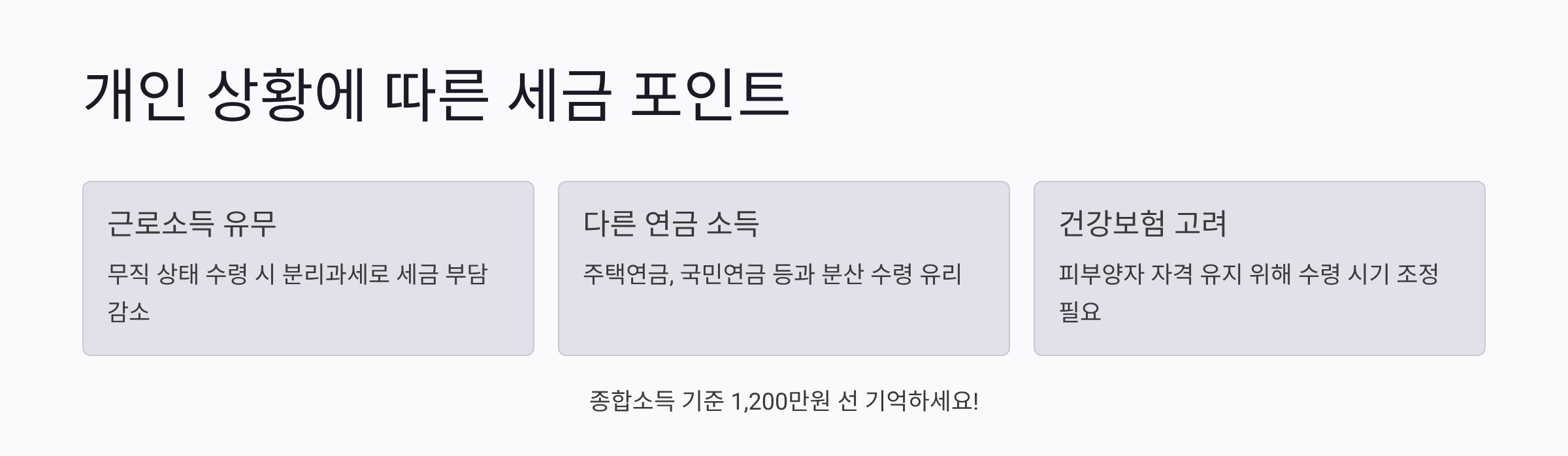 맞벌이 여부, 기타 투자 소득, 건강보험료 부담 등도 고려 대상이에요. 특히 건강보험 피부양자 자격 유지가 중요한 분은 연금 수령 시기를 조정할 필요가 있어요.