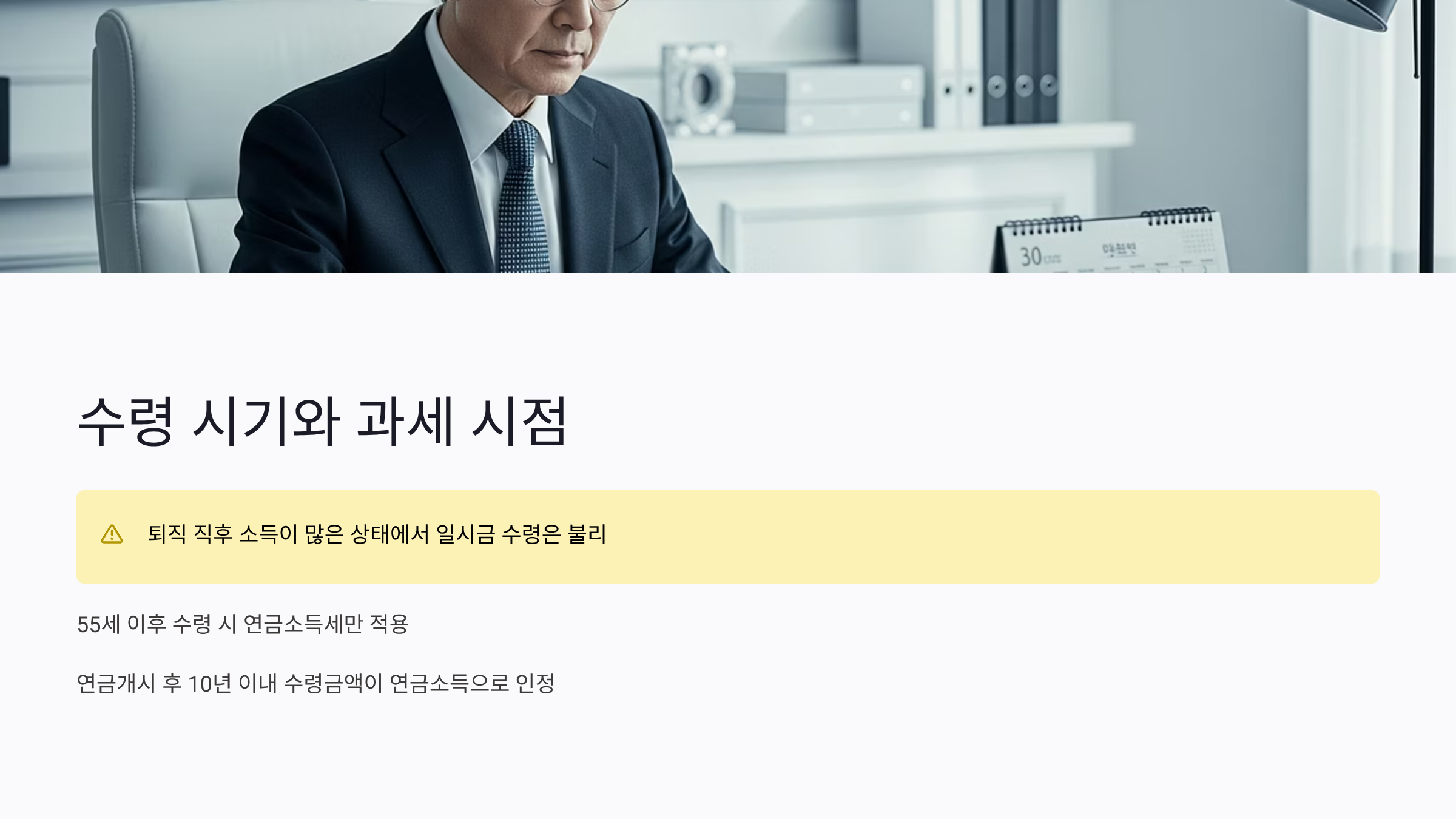 퇴직연금을 받는 시기는 세금과 직결돼요. 수령 시점에 따라 어떤 세율이 적용될지 달라지기 때문이죠. 특히 퇴직 직후 소득이 많은 상태에서 일시금을 받는 건 좋지 않아요.