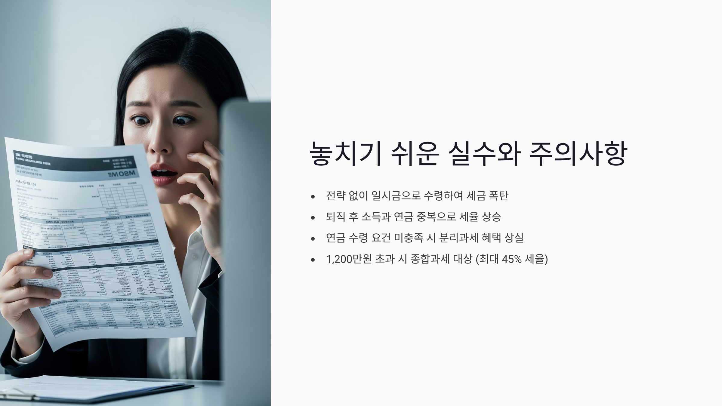 퇴직연금 수령 시 가장 흔한 실수는 아무 전략 없이 "일시금으로 그냥 받는 것"이에요. 생각보다 많은 분들이 그냥 목돈으로 받아 세금 폭탄을 맞고 후회해요.