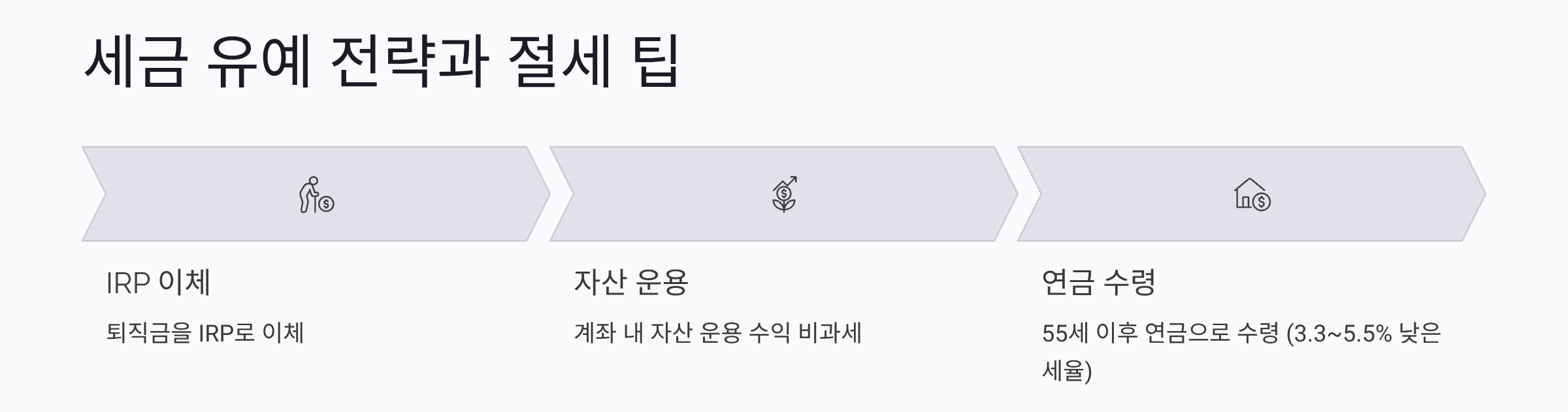퇴직연금을 수령하면서 가장 똑똑한 방법 중 하나는 '세금 유예' 전략을 활용하는 거예요. 즉, 지금 당장 과세되지 않도록 연금저축이나 IRP 계좌로 이체한 뒤, 차후 연금으로 수령하는 방식이죠.