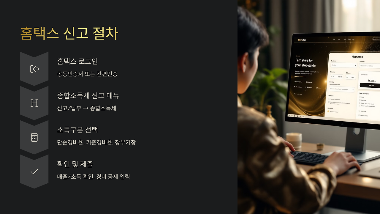 홈택스 신고는 생각보다 간단해요. 로그인 → 종합소득세 신고 → 신고서 작성 → 제출 순서입니다.