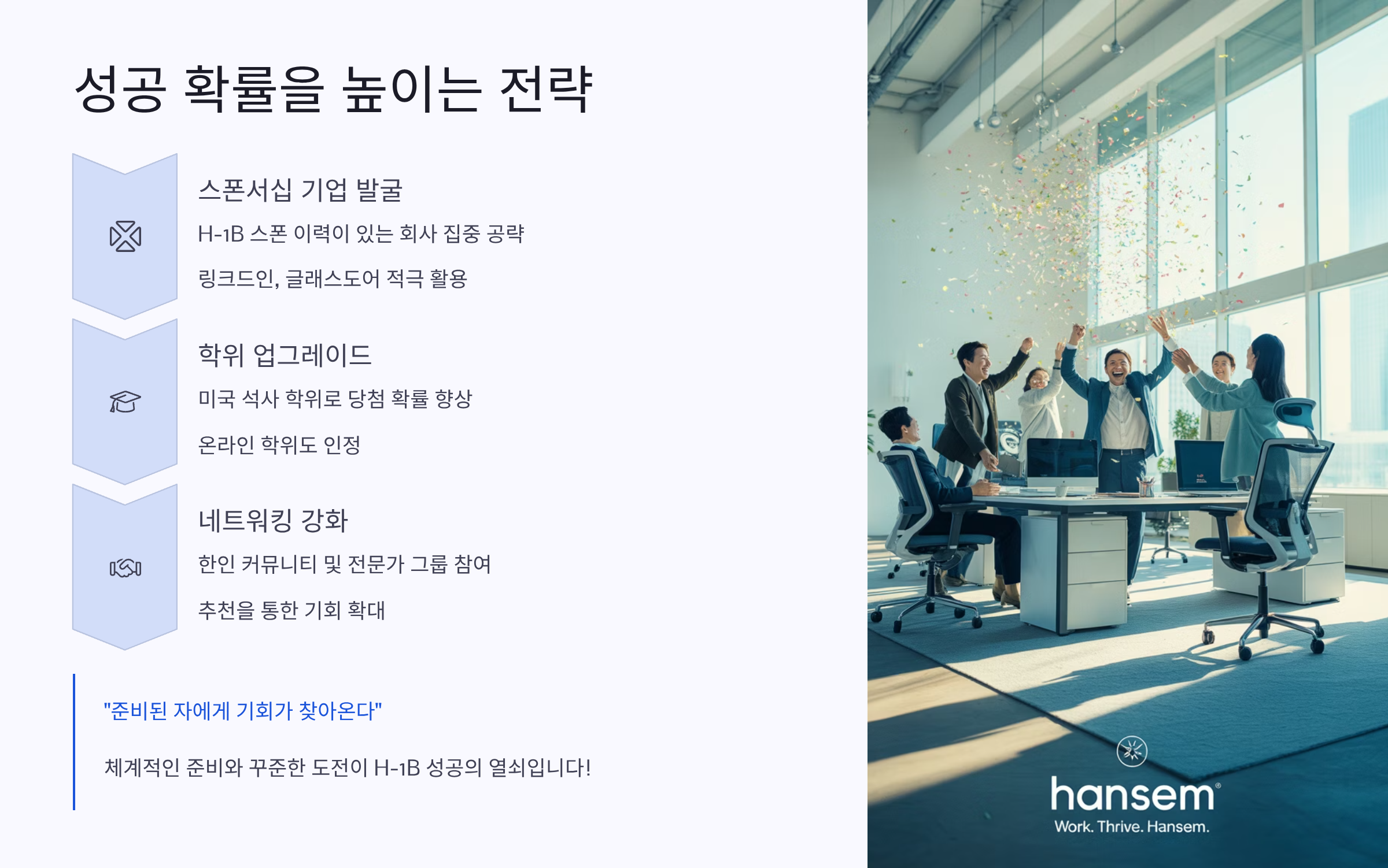 즉, H-1B는 장점과 단점이 뚜렷해요. 안정적인 장기 체류와 영주권 기회라는 매력 때문에 도전할 가치가 크지만, 불확실성과 제한 때문에 계획을 잘 세워야 해요. 그렇다면 합격률을 높이기 위해 지원자들이 어떤 전략을 세울 수 있을까요?