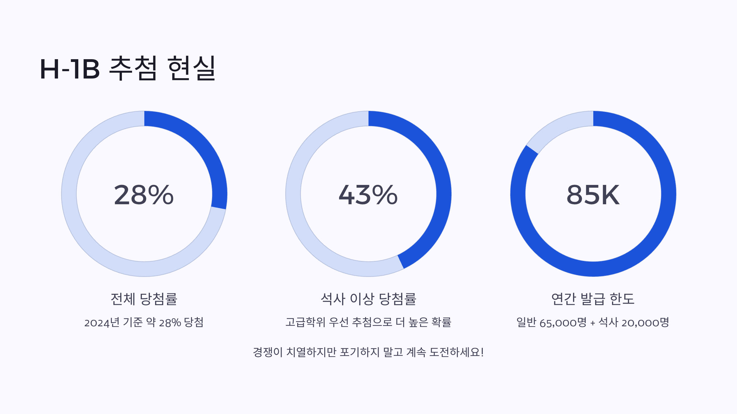 H-1B 비자의 가장 큰 난관은 바로 추첨 제도예요. 매년 신청자가 너무 많기 때문에 미국 이민국(USCIS)은 쿼터(cap)를 정해두고, 그 안에서 무작위 추첨을 통해 선발해요. 일반 쿼터는 약 65,000명, 미국 석사 학위 이상 소지자를 위한 추가 쿼터는 20,000명 정도로 총 85,000명 수준이에요.