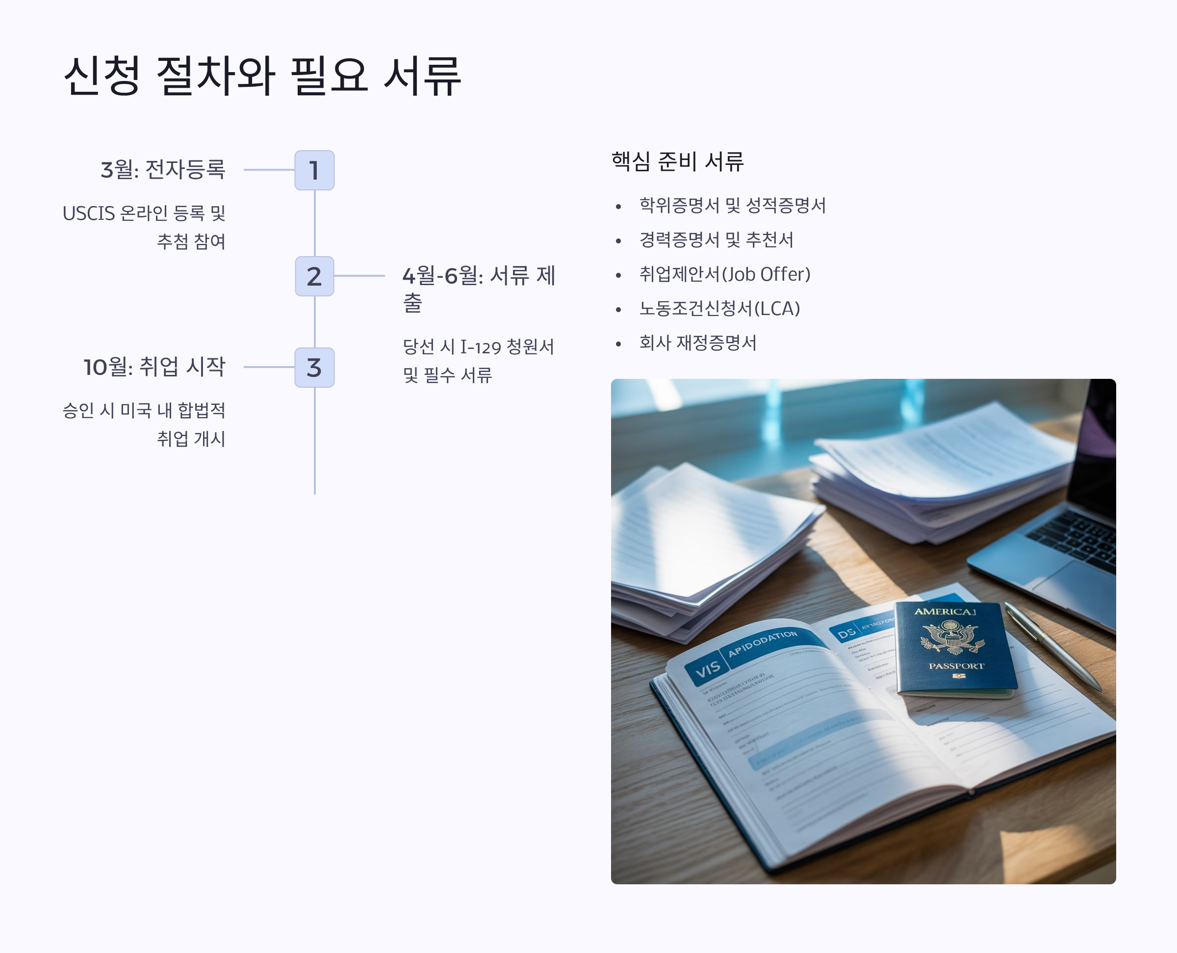 다음은 추첨 등록이에요. 매년 3월쯤 고용주가 USCIS(미국 이민국) 온라인 시스템에 신청자를 등록해야 해요. 이때 필요한 건 기본 인적 사항과 여권 정보 정도라 비교적 간단해요. 이후 4월에 본격적인 서류 심사가 시작돼요.
