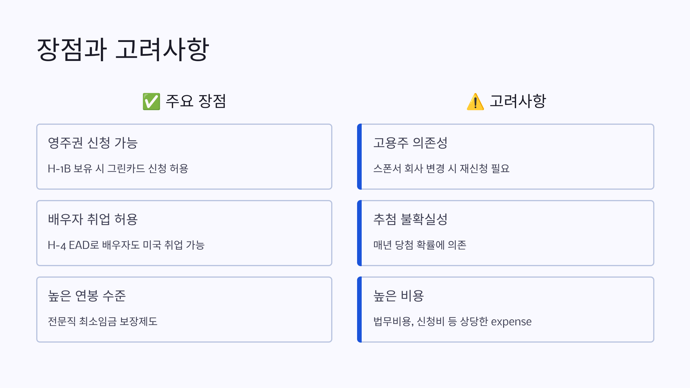 하지만 단점도 분명해요. 가장 큰 문제는 추첨 제도로 인한 불확실성이에요. 아무리 자격 요건이 충분해도 추첨에서 탈락하면 기회조차 얻지 못해요. 그래서 수년간 계속 도전하는 사람들도 있어요. 두 번째는 고용주 의존도가 높다는 점이에요. 비자는 회사 스폰서 기반이기 때문에, 회사 사정이 나빠지거나 이직이 어려운 경우 큰 타격을 받을 수 있어요.