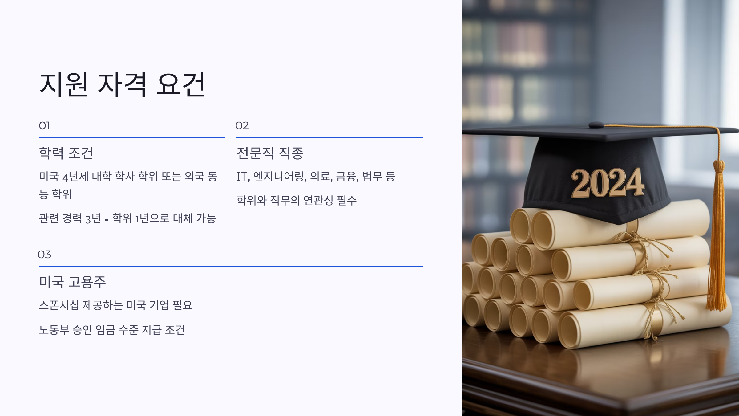 이처럼 H-1B는 미국에서 전문직으로 경력을 쌓고 싶은 사람들에게 가장 중요한 관문이자, 동시에 가장 어렵게 접근할 수 있는 취업 루트예요. 그럼 이제 구체적으로 어떤 사람들이 지원할 수 있는지 자격 요건을 살펴볼까요? 🎓