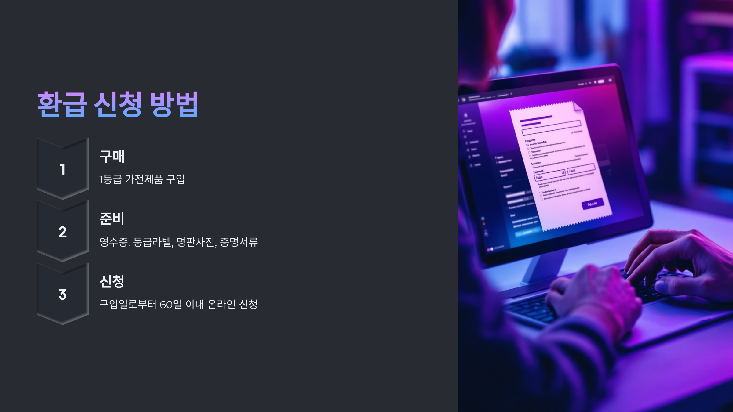 온라인으로만 신청 가능해요. 구입일 기준 60일 이내 신청해야 하며, 필수 서류가 꼭 필요합니다.