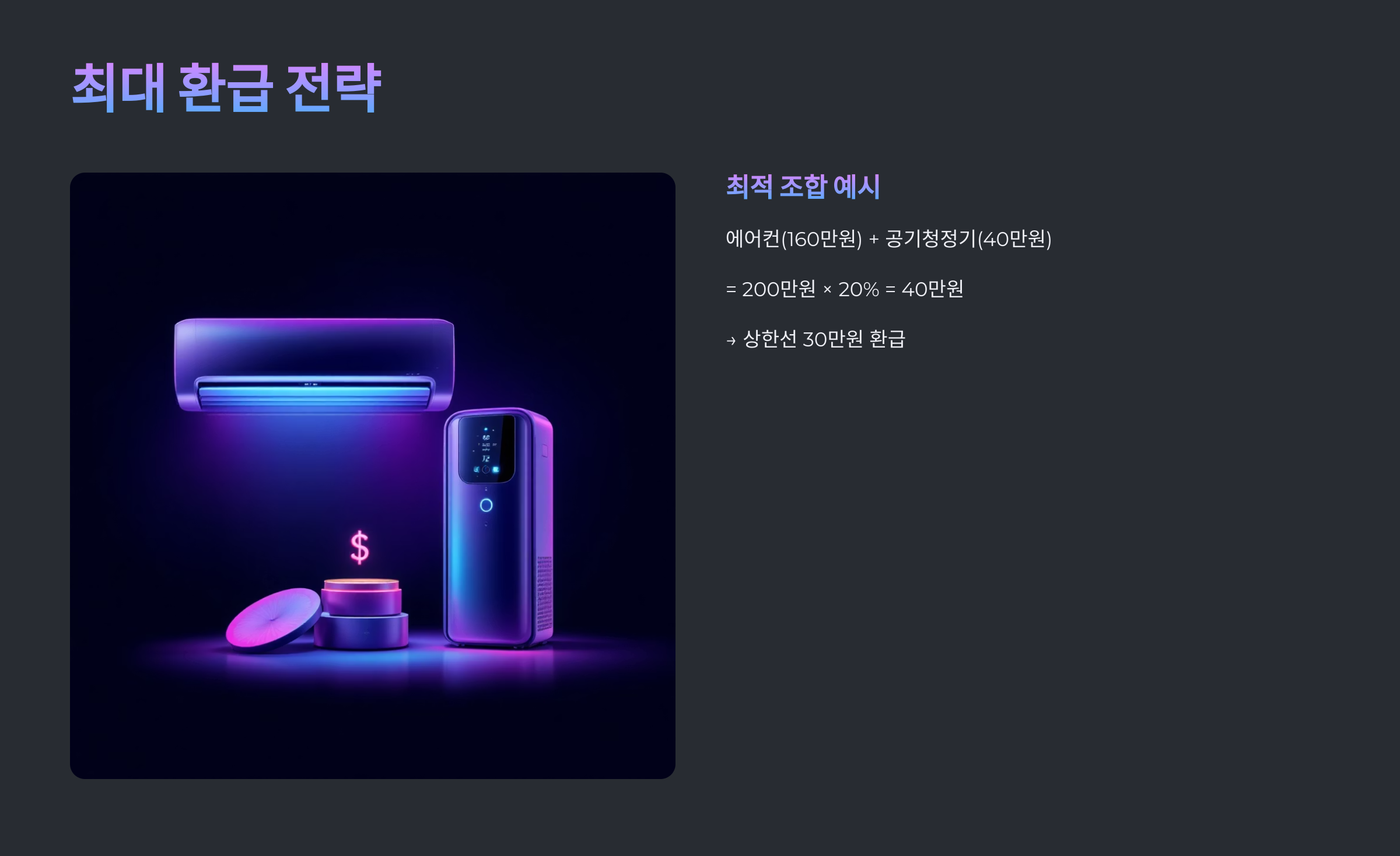 예) 에어컨(160만 원) + 공기청정기(40만 원) → 200만 원 × 20% = 40만 원 → 상한선 30만 원 환급