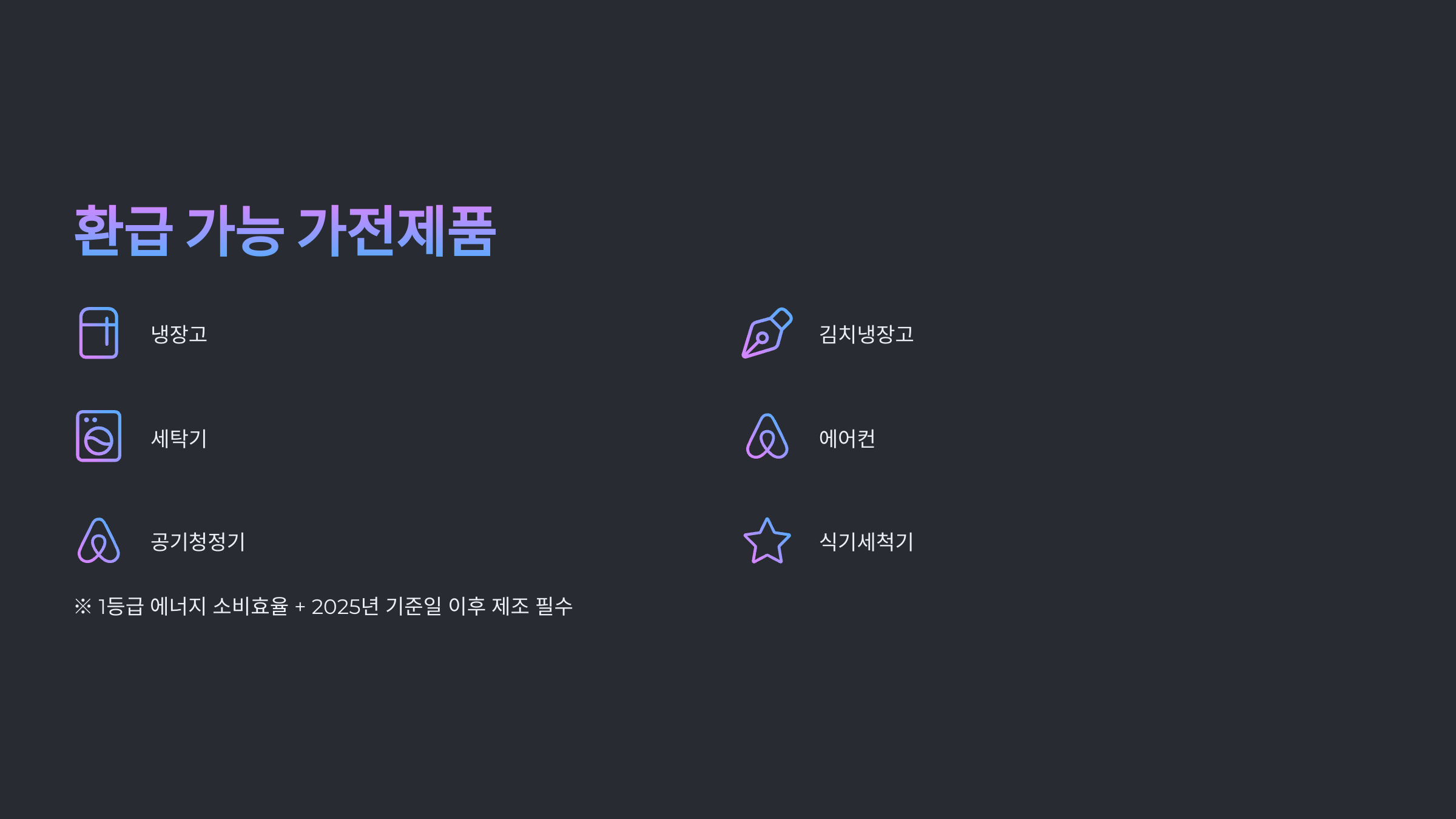 지원 대상 가전제품은 총 11종으로 제한되어 있으며, 반드시 1등급 에너지 소비효율 라벨이 붙어 있고, 2025년 기준일 이후 제조된 제품이어야 해요. 또한, 예산이 소진되면 조기 종료될 수 있어서 빠른 신청이 중요해요.