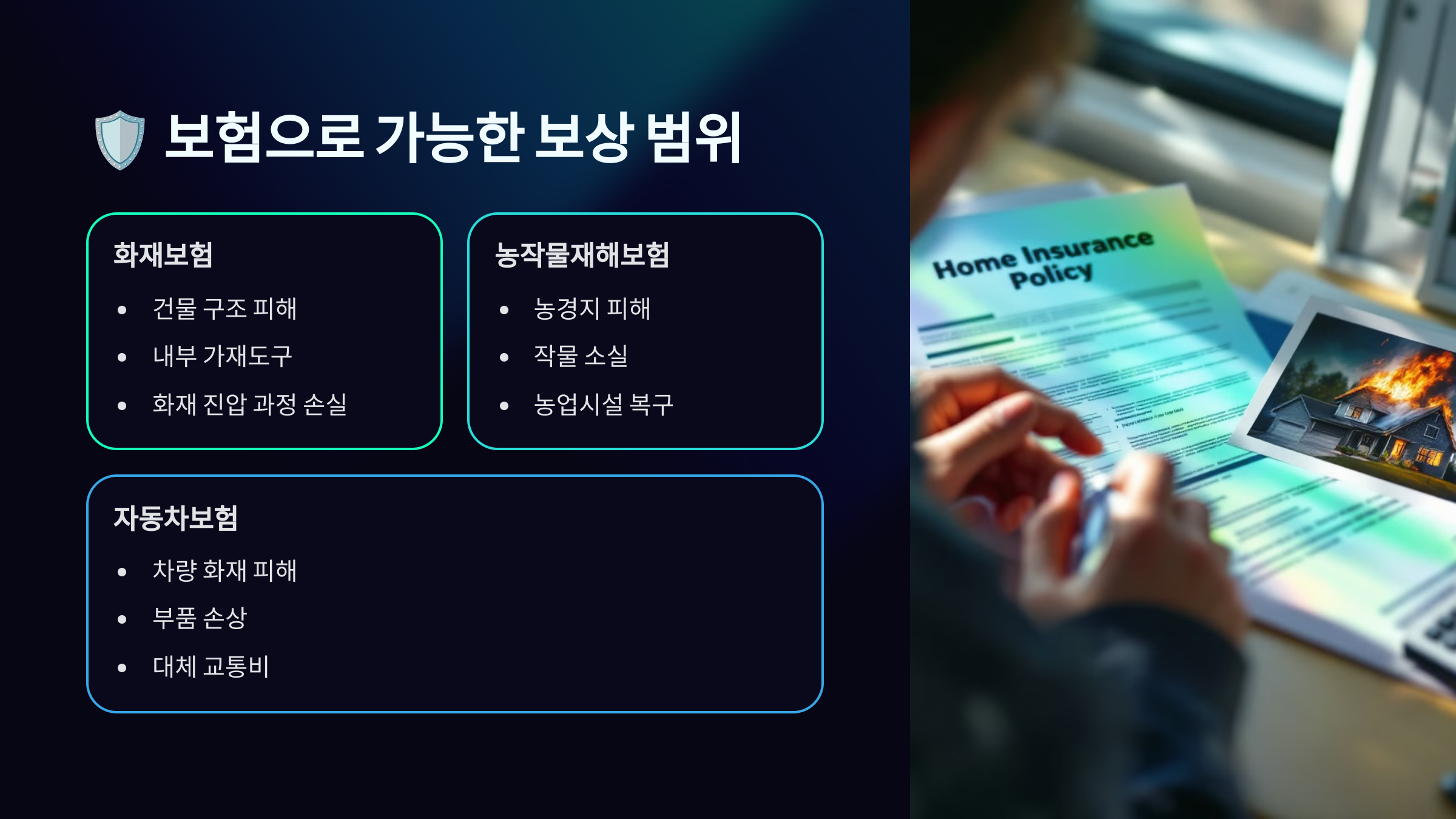 많은 분들이 궁금해하는 게 바로 보험으로 산불 피해를 보상받을 수 있느냐는 거예요. 결론부터 말하자면, 가입한 보험 종류에 따라 상이하지만 일부 보상이 가능합니다.