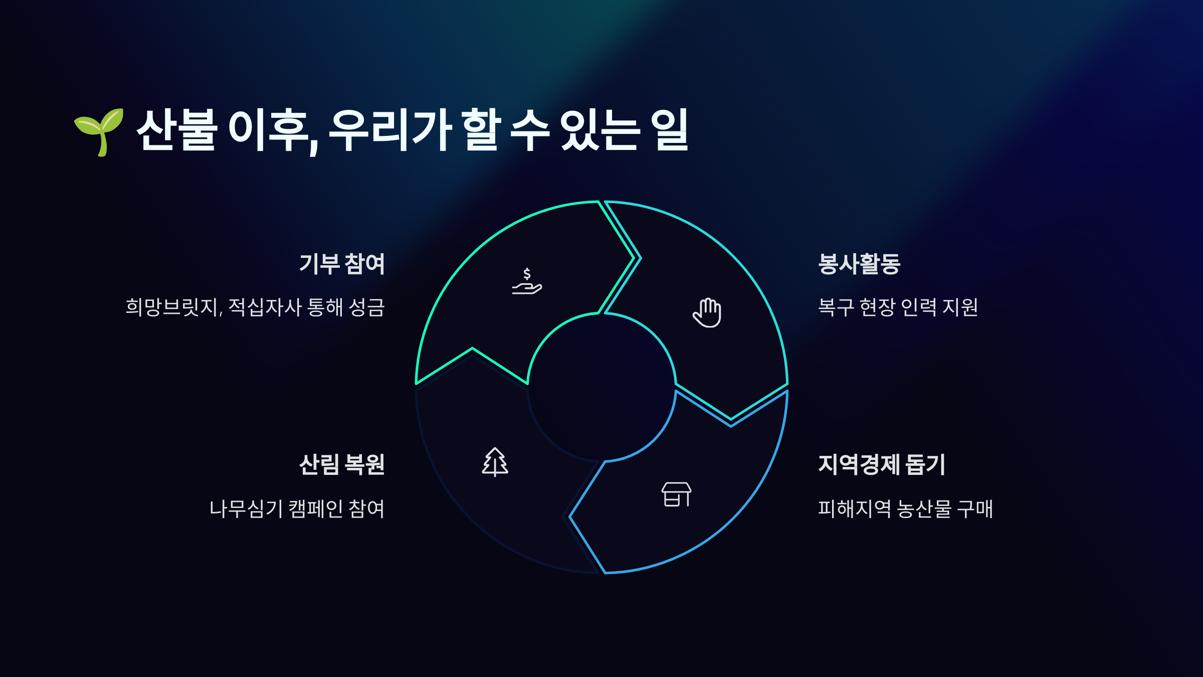 실제로 현재 피해 지역에는 낙엽 속 불씨 제거, 식수 작업, 연료물질 분리작업 등을 돕는 인력이 부족한 상황이에요. 이건 단순한 봉사가 아니라 우리 산림을 지키는 미래 투자</strong랍니다.