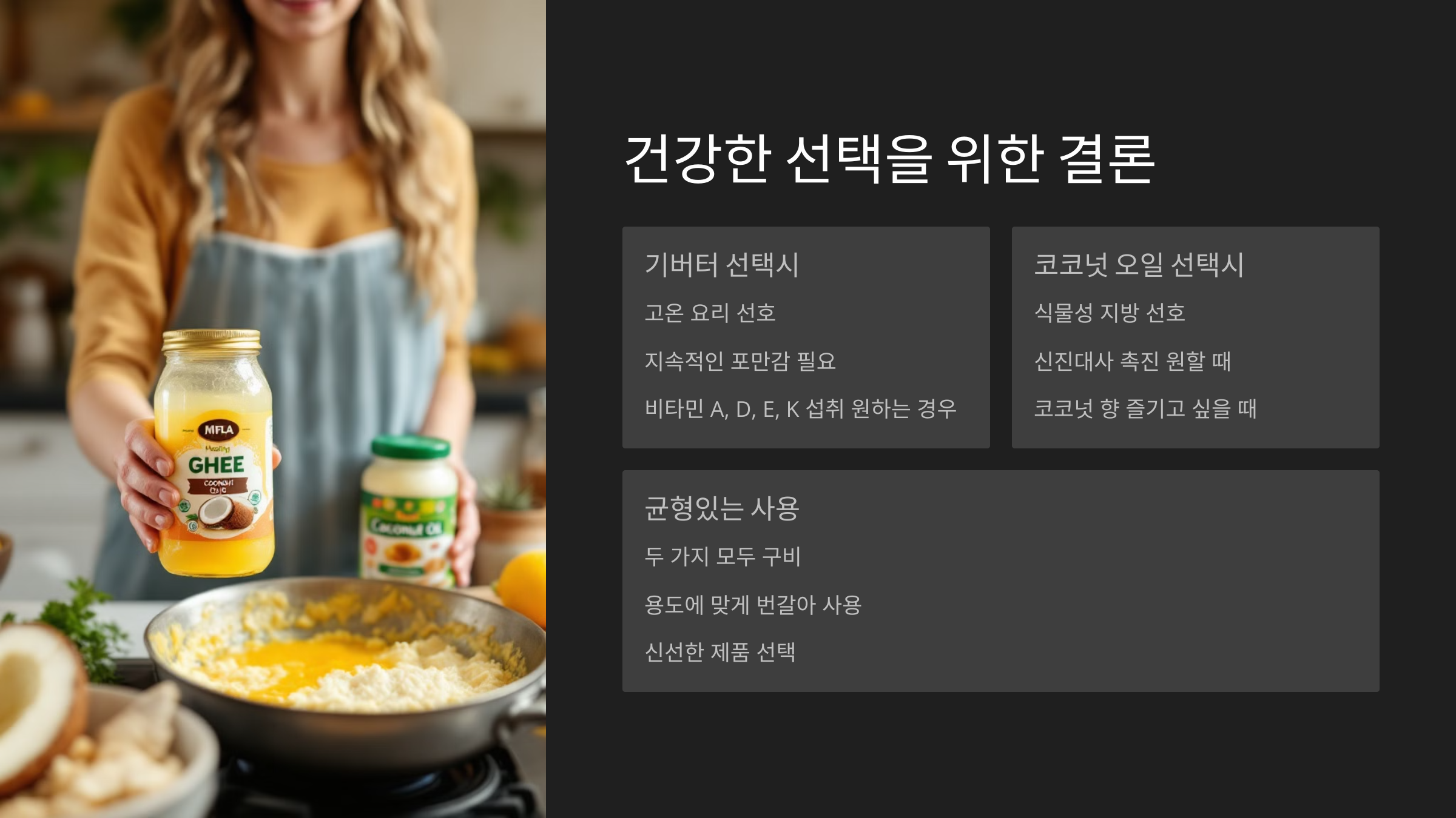 기버터와 코코넛오일, 어느 하나가 무조건 더 낫다고 하긴 어려워요. 당신의 건강 상태, 식단 스타일, 요리 습관에 따라 맞춤 선택이 필요하죠!