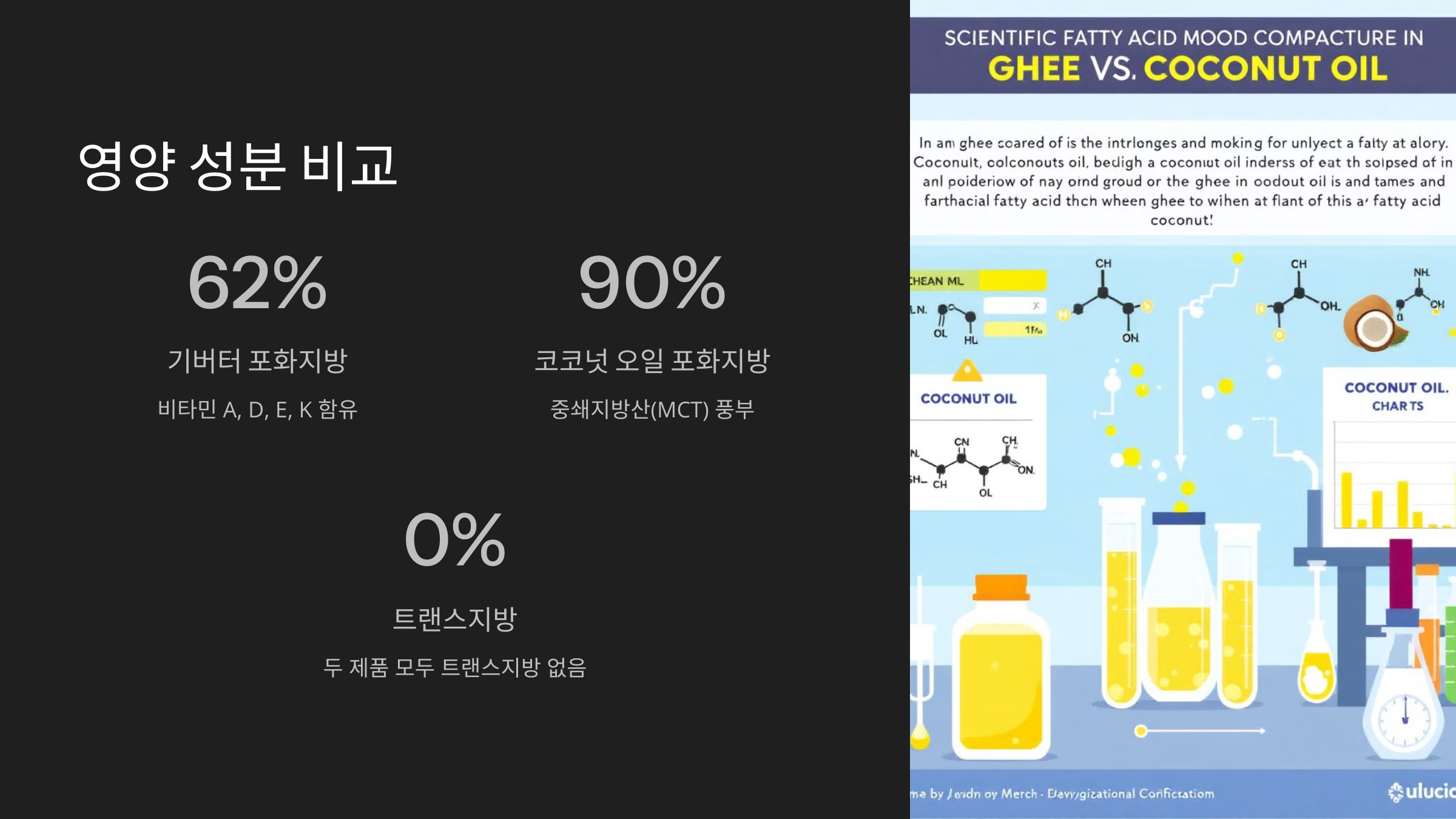 | 주요 성분 | 비타민 A, D, E, K2, CLA, Butyrate | MCT(카프릴산, 카프르산), 항산화 성분 |