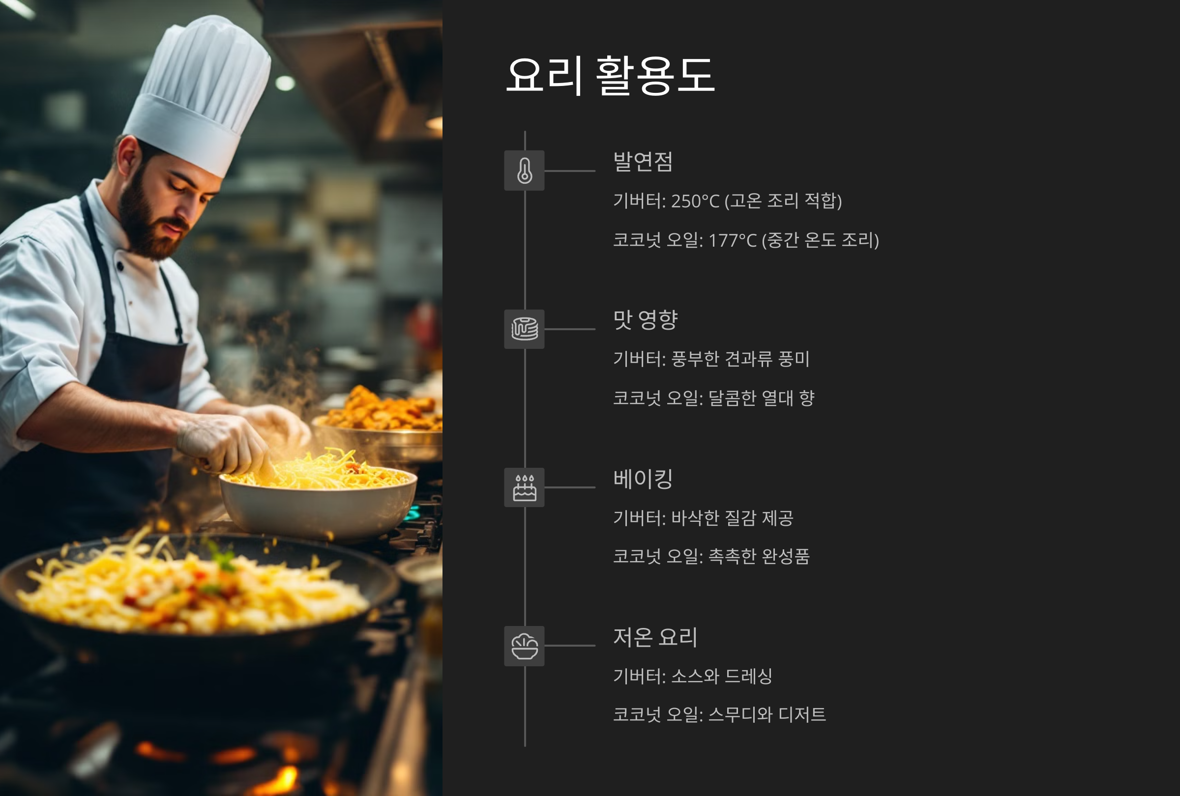 - 코코넛오일: 발연점 약 170~180도. 저온 요리, 베이킹에 적합