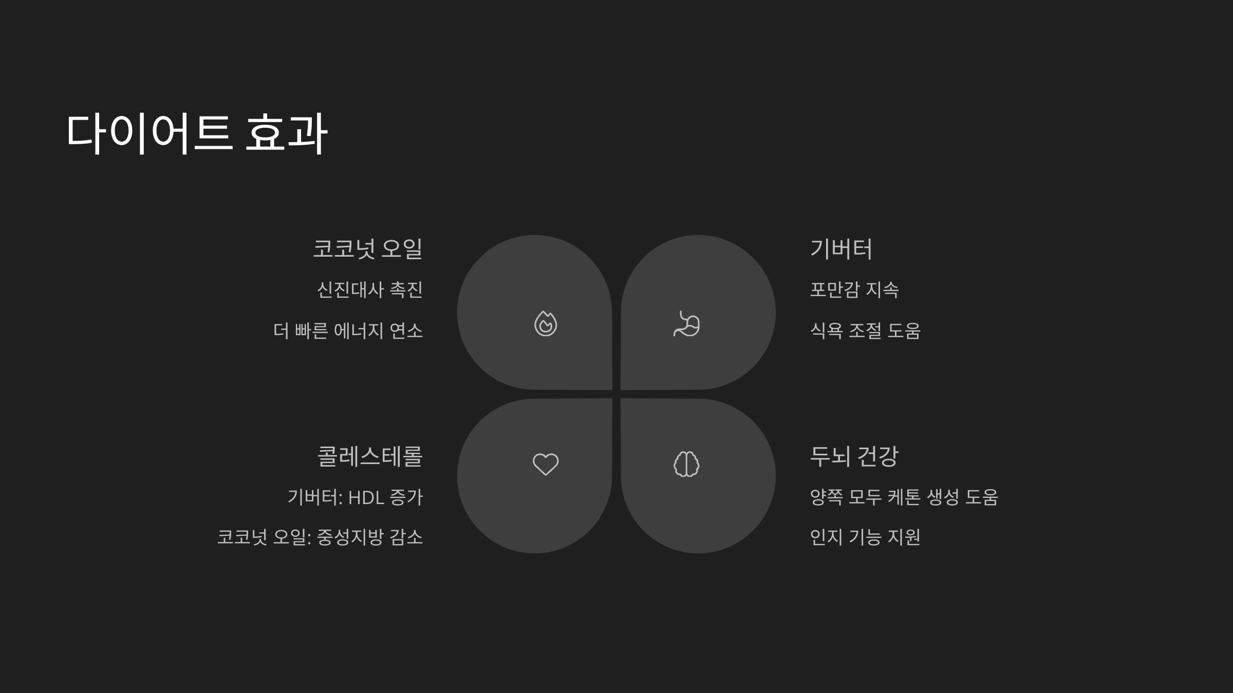 | 다이어트, 체중 감량 | 코코넛오일 | MCT 풍부, 에너지로 빠르게 전환 |