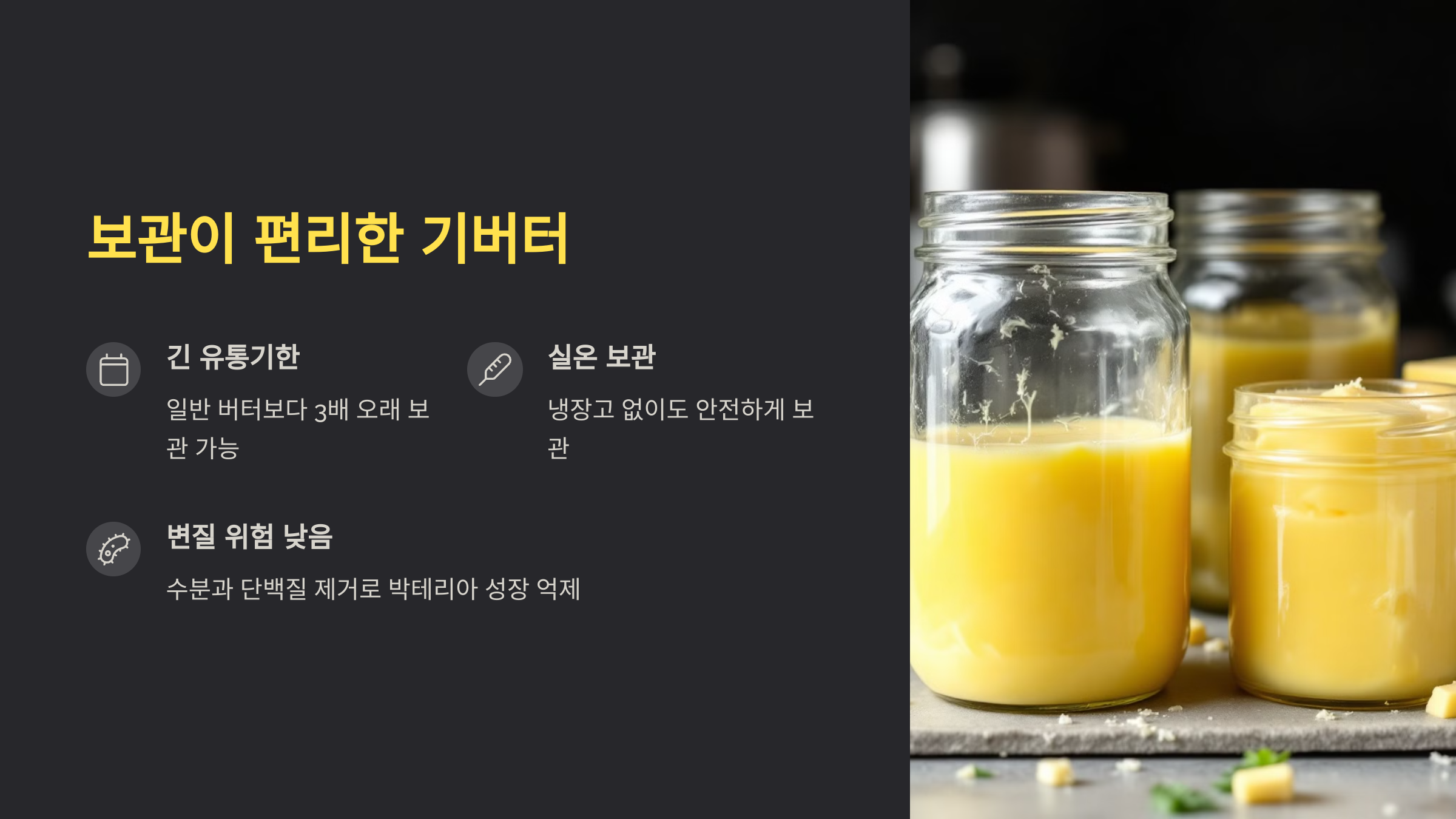 일반 버터는 냉장 보관이 필수이고, 실온에 오래 두면 쉽게 산패해요. 반면 기버터는 수분이 없어 실온에서도 보관 가능해요. 밀폐만 잘하면 수개월 동안 사용해도 맛과 품질이 변하지 않아요.