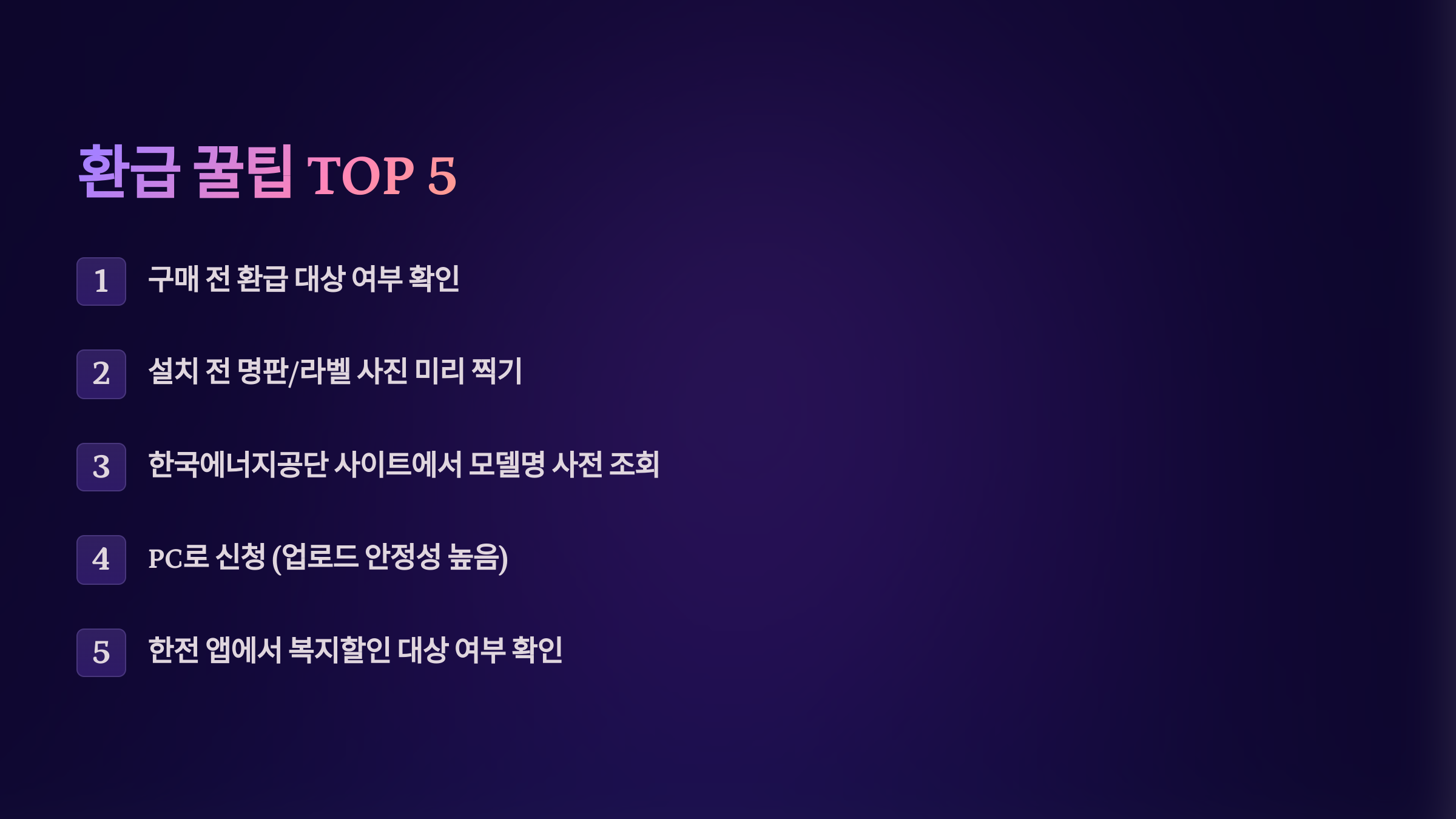 - 제품 구매 전 반드시 환급 대상 여부 확인 (등급 + 제조일 + 복지조건)
