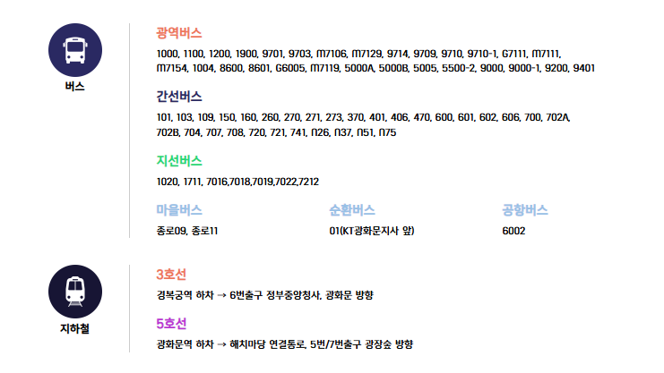 - 대중교통 이용: 행사장 주변에 공영주차장이 있긴하나 교통이 혼잡하니 지하철(3호선 경복궁역, 5호선 광화문역 9번 출구에서 약 100m(도보 2분) 거리)을 이용하는 것이 가장 편리합니다.