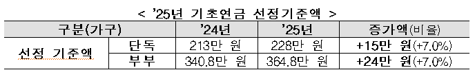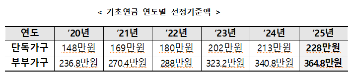 - 2025년: 단독가구 228만 원, 부부가구 364만 8,000원