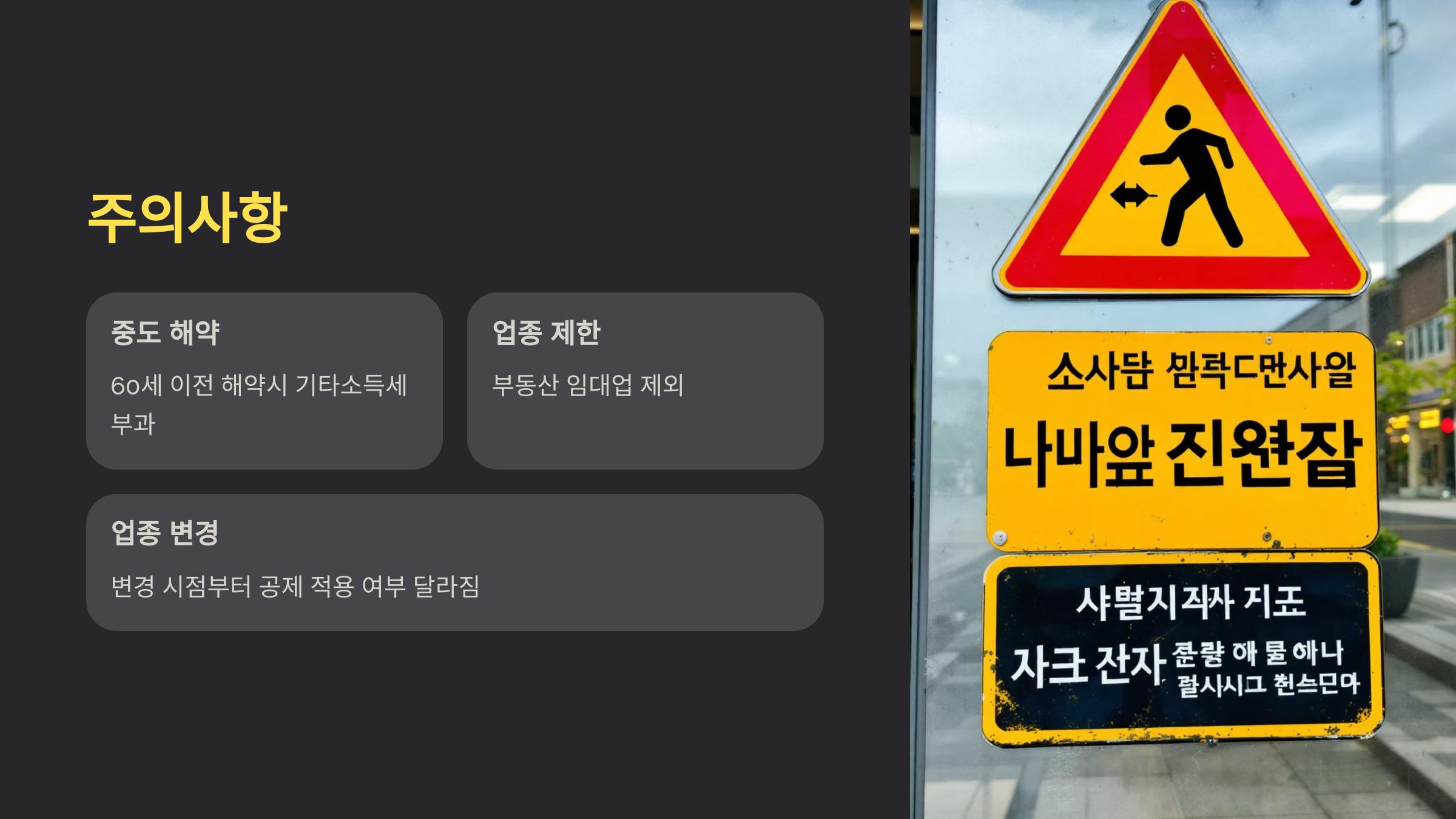 | 업종 변경 | 변경 시 공제 중단 | 공제 제외 업종 전환 시 주의 |