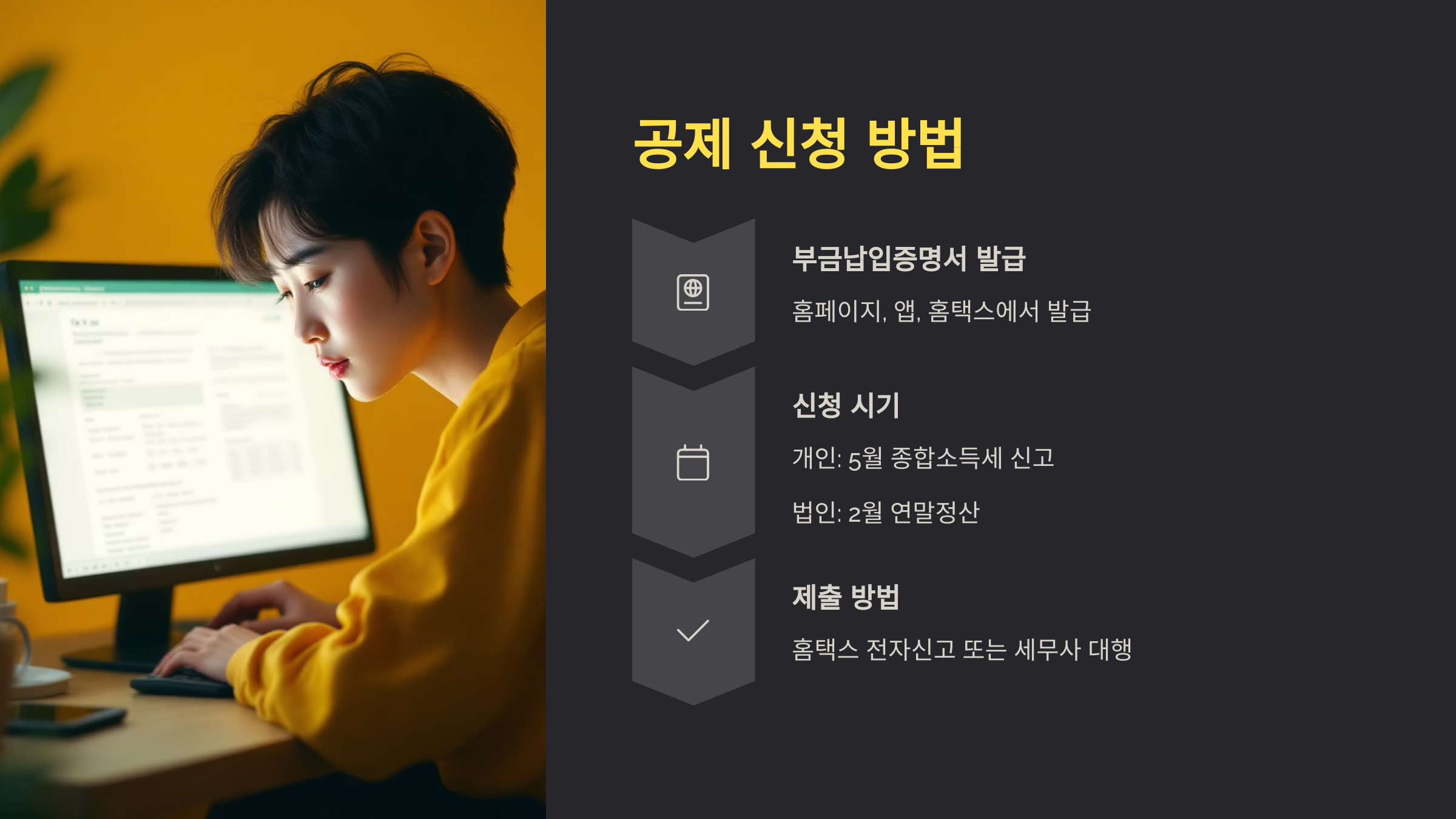 노란우산공제를 통해 세액공제를 받기 위해선 신청 시기와 방법을 잘 알아야 해요. 개인사업자와 법인 대표자 각각 신청 방식이 다르기 때문에 헷갈리지 않도록 주의가 필요해요. 기본적으로는 ‘부금납입증명서’를 제출해야만 소득공제가 인정돼요.