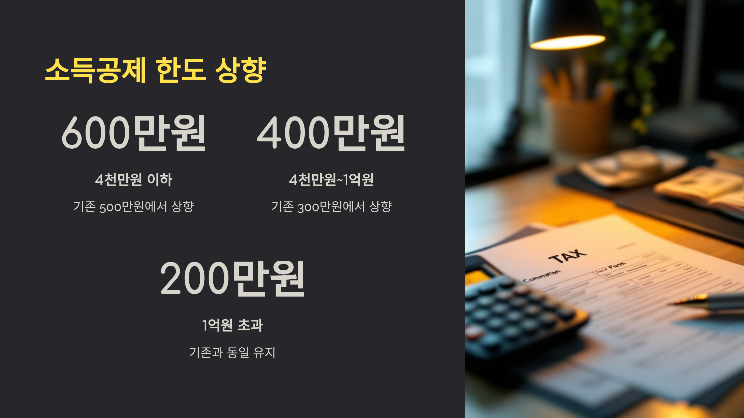 가장 주목할 만한 변화는 연 소득 4천만 원 이하 사업자의 경우, 소득공제 한도가 기존 500만원에서 600만원으로 100만원 확대된 점이에요. 연 소득 4천만 원 초과~1억원 이하는 기존 300만원에서 400만원으로 상향됐어요. 1억원 초과 구간은 기존과 동일하게 200만원 한도가 유지돼요.