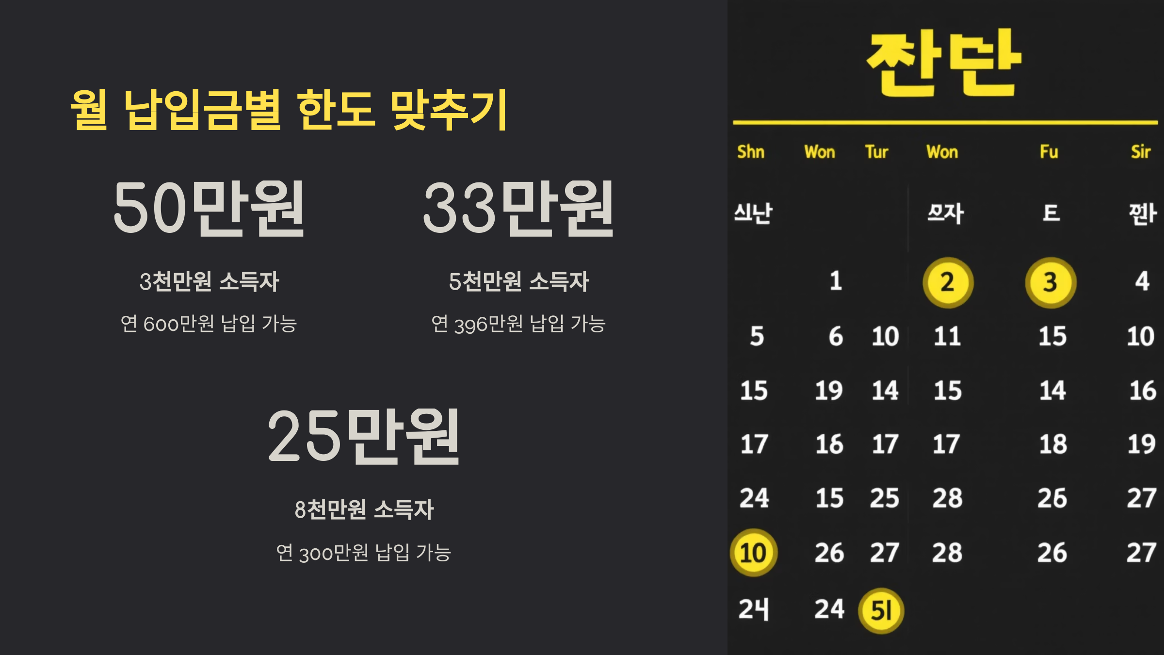 - ✔ 납입액은 소득에 맞게 조절해야 효과적