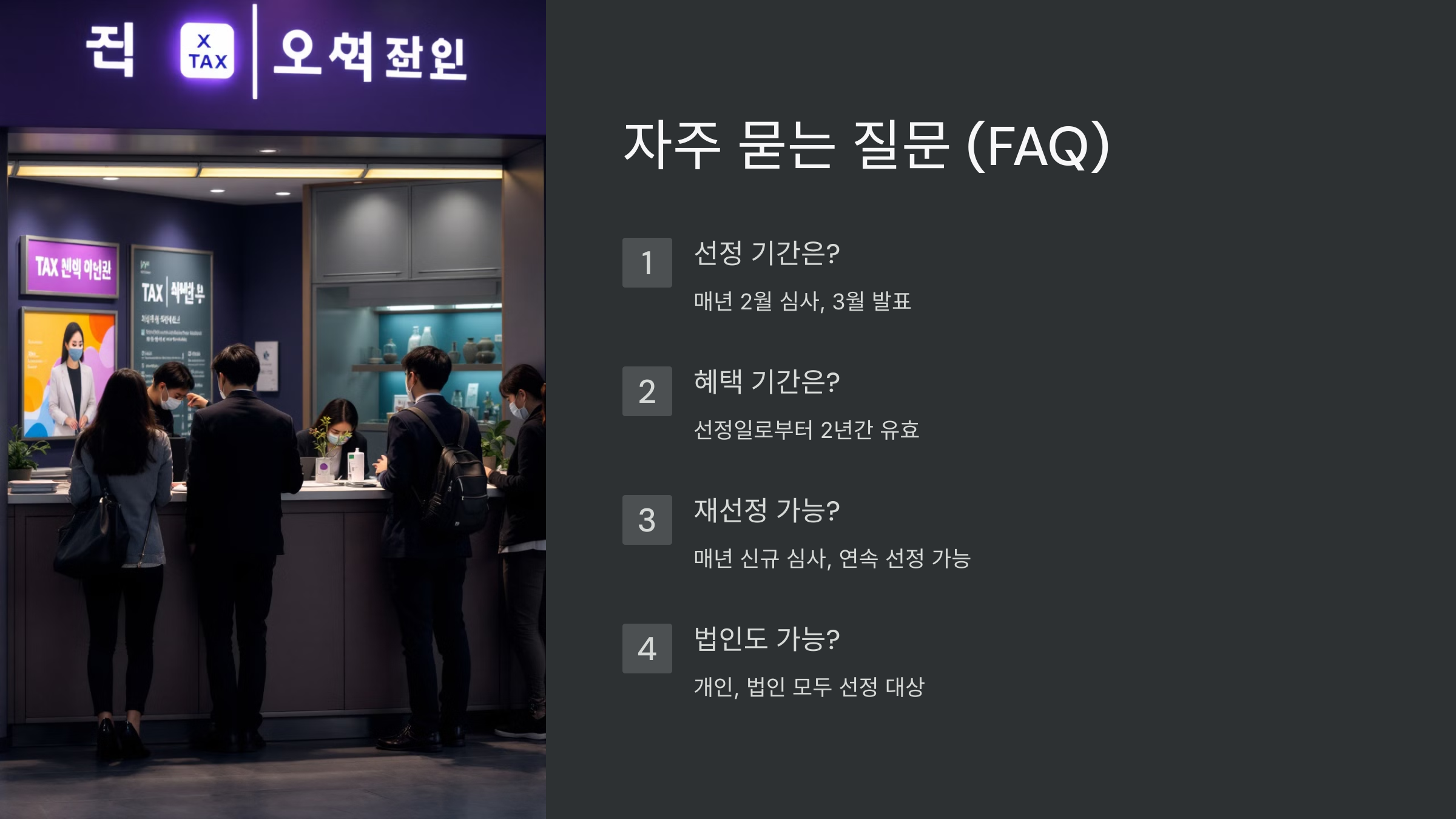 A8. 네, 선정되면 세무서 및 관련 기관에서 즉시 혜택 안내를 받을 수 있어요.