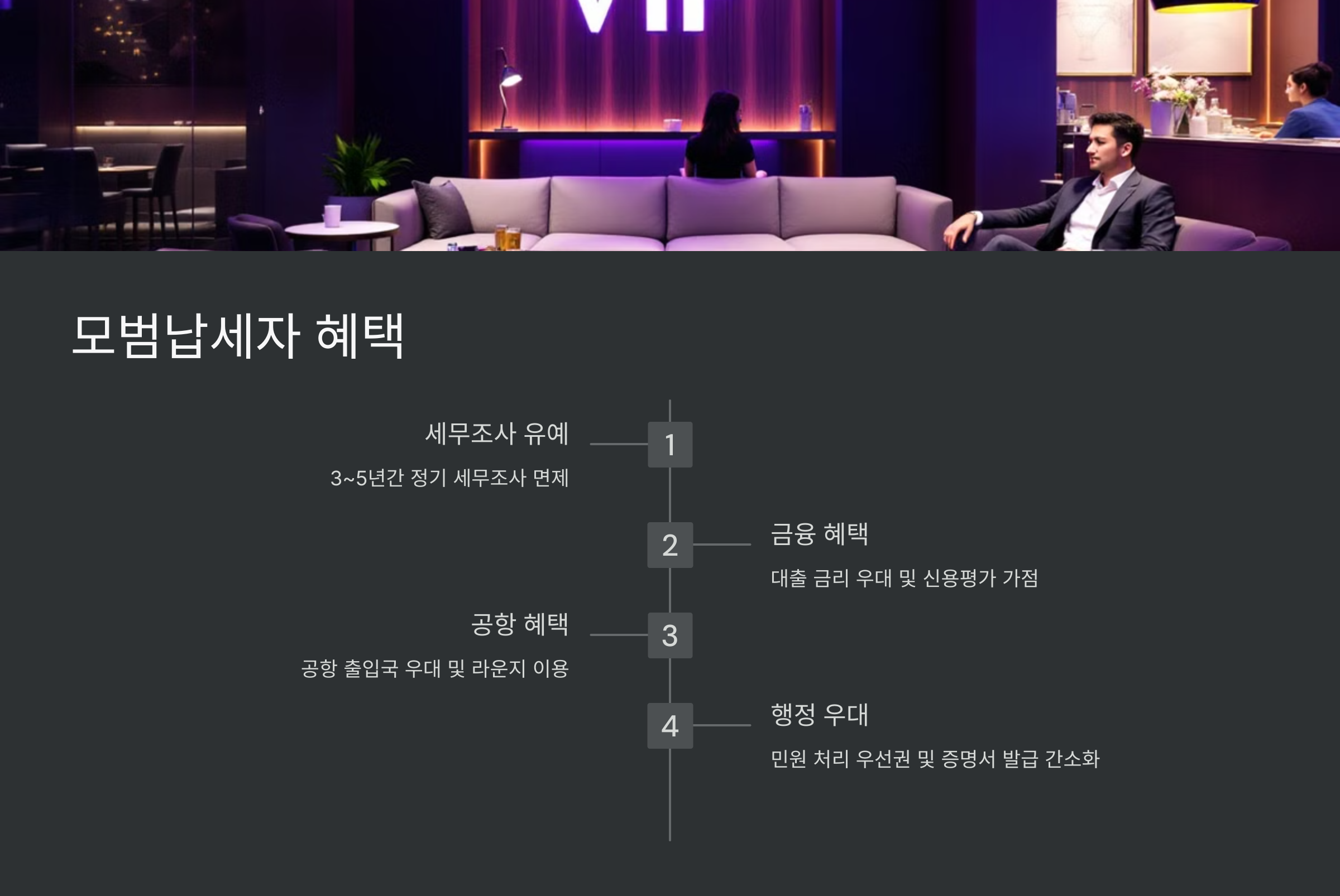 A2. 세금 감면, 세무조사 면제, 공항 VIP 혜택, 신용점수 상승, 대출 금리 인하 등의 혜택을 받을 수 있어요.