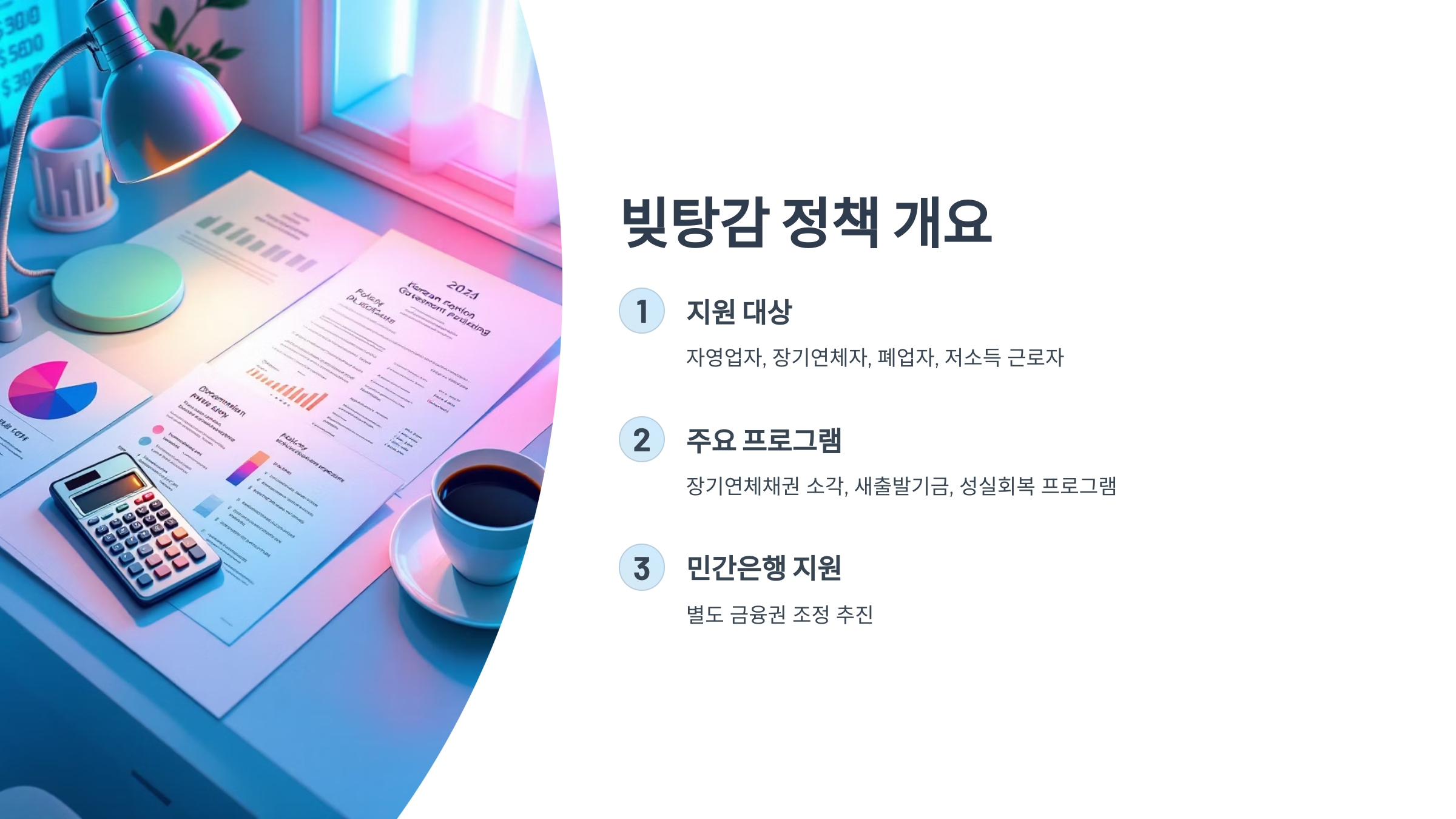총 지원 프로그램은 다음 3가지로 나뉘어요. 첫째는 장기연체채권 매입 후 소각, 둘째는 ‘새출발기금’을 통한 원금 감면, 셋째는 성실하게 갚아온 사람들을 위한 ‘성실회복 프로그램’이에요. 이외에도 민간은행 대출자들을 위한 별도 금융권 조정도 함께 추진돼요.