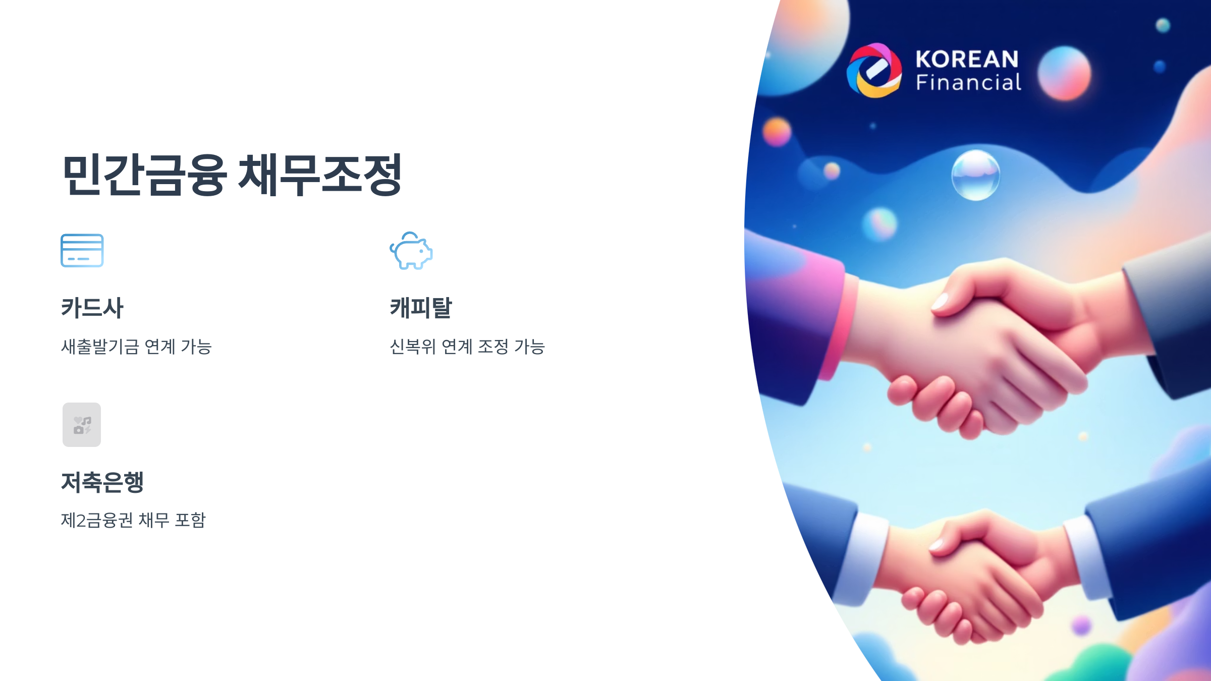 많은 분들이 궁금해하는 부분이에요. 정부 채무조정 프로그램은 대부분 공공기관이나 1금융권 중심으로 운영되었지만, 이번엔 민간금융 채무도 포함돼요! 카드사, 캐피탈, 저축은행 같은 제2금융권 채무도 새출발기금이나 신복위 연계로 조정이 가능해진 거예요.