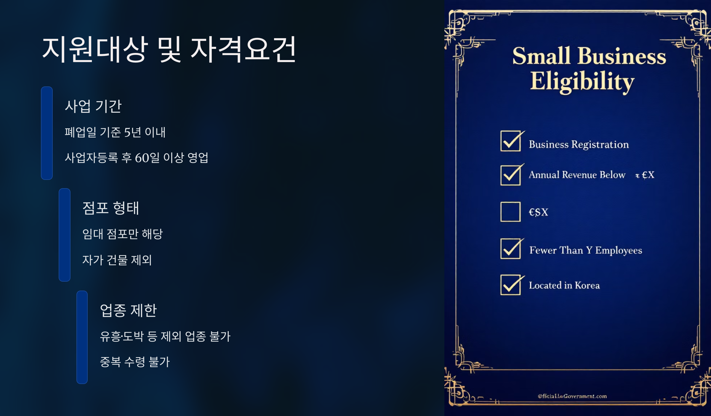 폐업지원금을 받기 위해서는 몇 가지 기준을 충족해야 해요. 2025년 기준으로 적용되는 자격요건을 살펴보면 다음과 같아요.