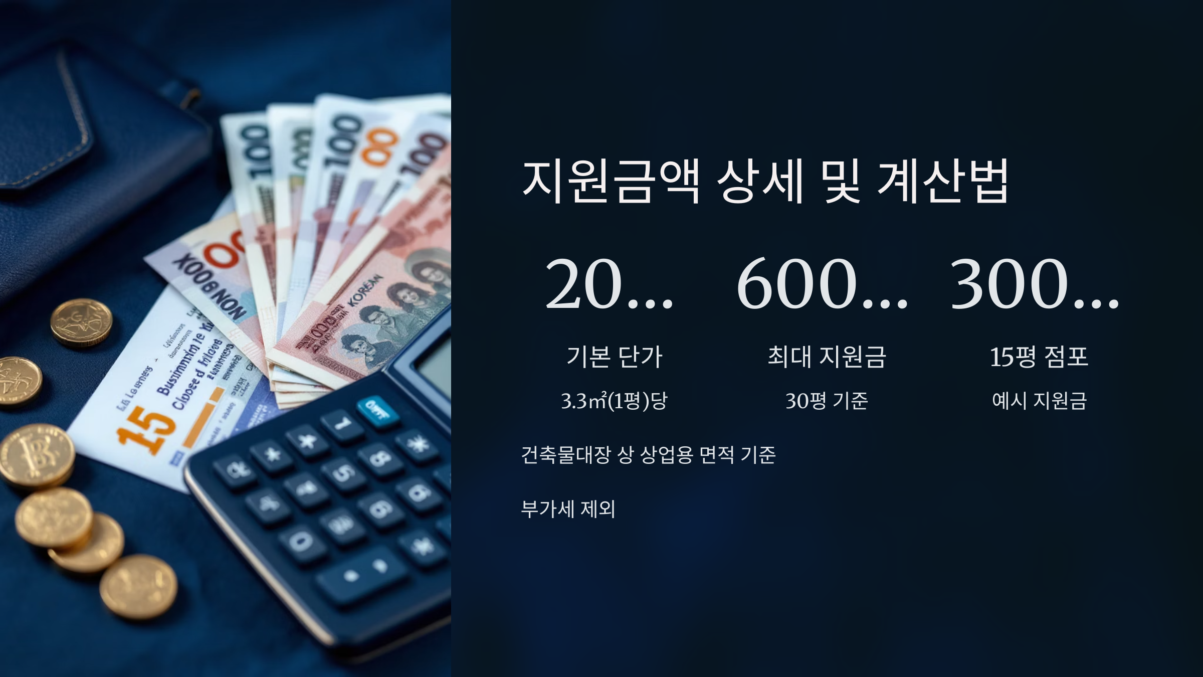 예를 들어, 15평 점포는 약 300만원, 30평 점포는 600만원 한도까지 가능해요. 단, 부가세는 제외이고 건축물대장 상 상업용 면적 기준이 중요합니다.