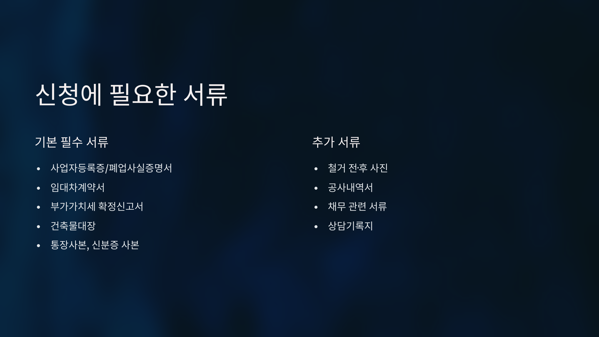 이제 단순한 ‘철거비 보조금’이 아니라, 점포 철거부터 세무·법률·채무 문제까지 원스톱으로 해결해주는 종합적 패키지로 발전했어요. 이 글에서는 제도 전반, 신청 자격, 필수 서류, 절차, 그리고 자주 묻는 질문까지 꼼꼼하게 알려드릴게요. 😊