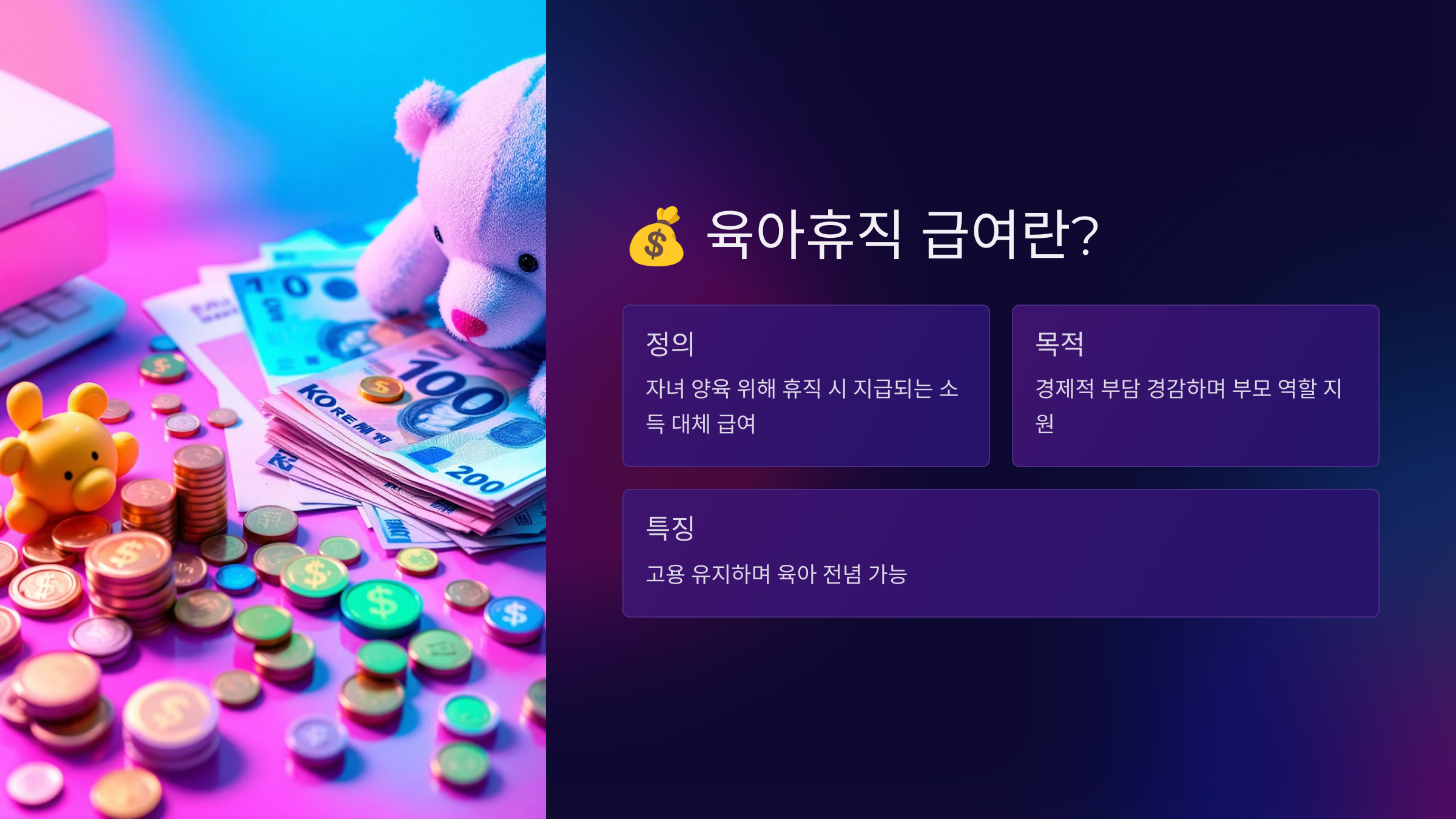 육아휴직 급여는 근로자가 육아휴직을 사용하는 동안 정부에서 일정 금액을 지원해 주는 제도예요. 이를 통해 부모가 안정적인 소득을 유지하며 자녀를 돌볼 수 있죠. 💙
