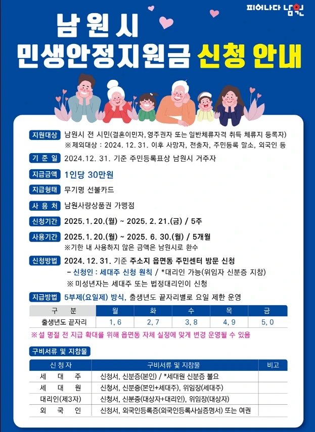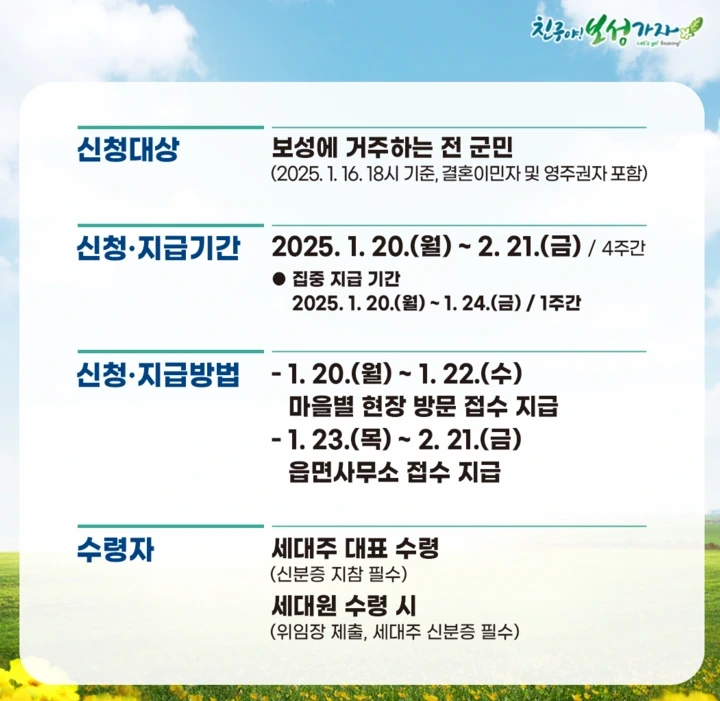 - 신청 장소: 주민등록 주소지 관할 행정복지센터