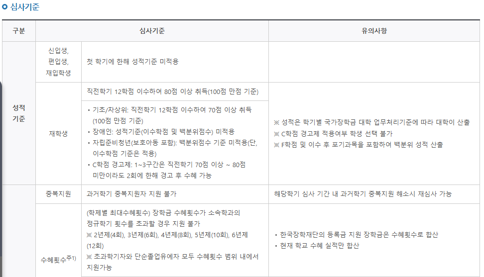 - 신입생, 편입생, 재입학생: 첫 학기에는 성적 기준이 면제됩니다.