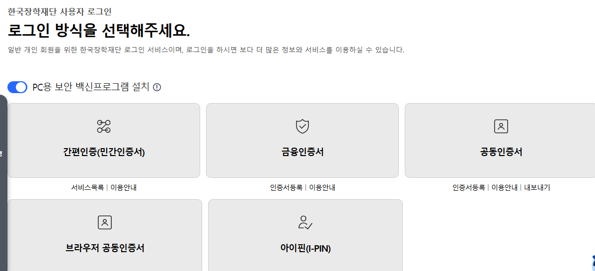 - 본인 명의의 인증서(금융인증서, 간편 인증 등)를 준비하여 회원가입 후 로그인하세요.