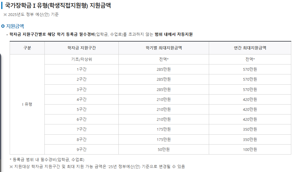 - 1~3구간: 등록금 전액 지원(최대 570만 원).