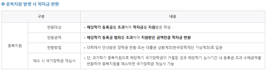 또한, 동일 학기 내에서 다른 장학금이나 학자금 대출을 통해 등록금 범위를 초과하는 금액을 지원받았다면, 중복 지원이 발생해 그 초과 금액만큼 반환해야 해요. 반환이 완료되면 국가장학금 심사를 다시 받을 수 있어요.