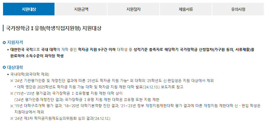 또한, 학생 본인의 가구가 소득인정액 기준으로 학자금 지원 9구간 이하에 해당해야 해요. 여기에 더해 직전 학기 성적 기준도 충족해야 한답니다. 재학생의 경우 직전 학기에 최소 12학점을 이수하고 100점 만점 기준으로 80점 이상을 받아야 해요. 기초생활수급자나 차상위계층은 성적 기준이 조금 더 완화되어 70점 이상이 필요하고요. 장애 학생은 성적 기준이 적용되지 않는 점도 참고하세요.