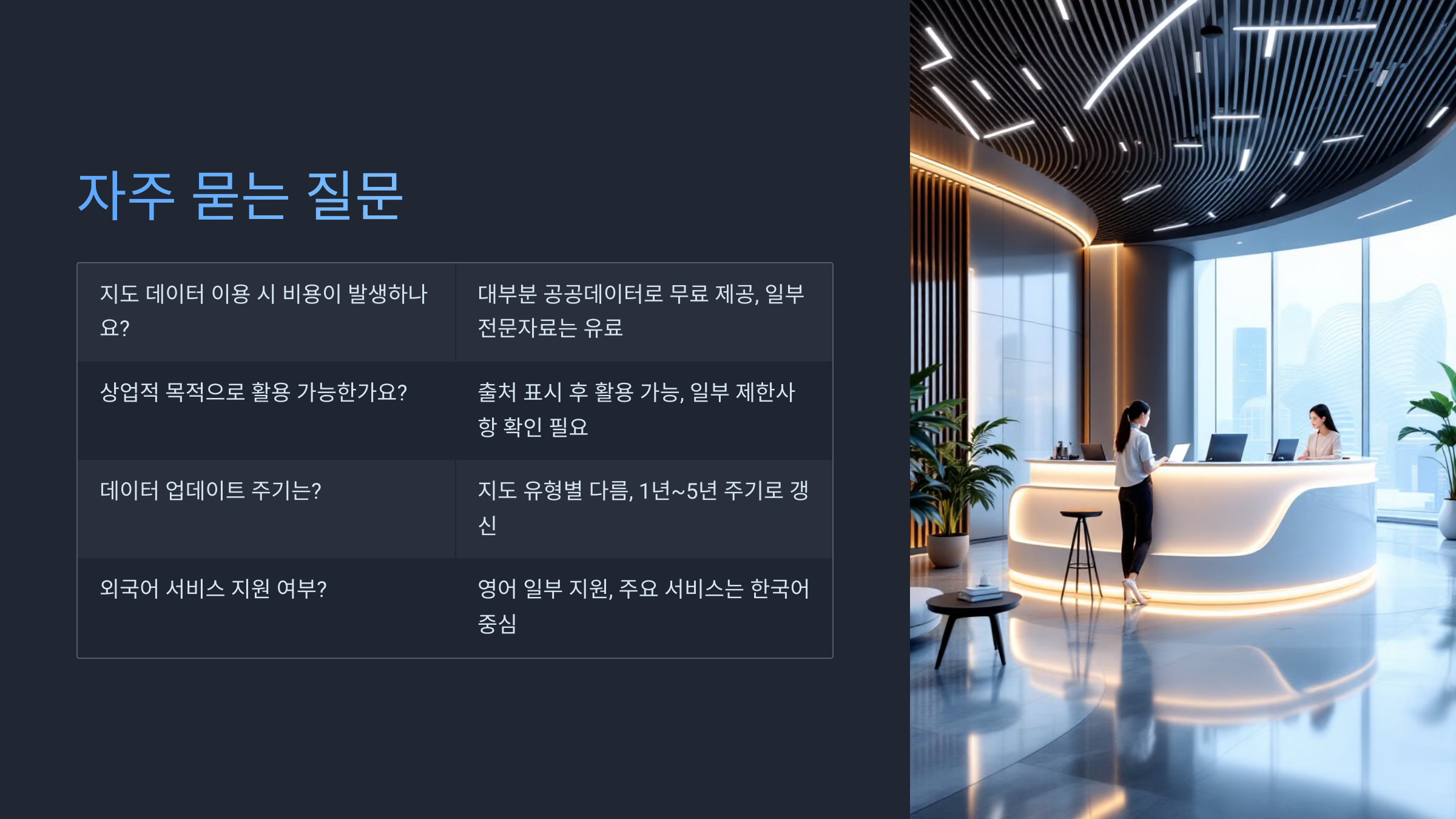 A1. 네, 대부분의 서비스는 일반 사용자도 로그인 없이 무료로 이용할 수 있어요. 다만 일부 고해상도 지도나 전문 데이터는 회원가입이 필요해요.