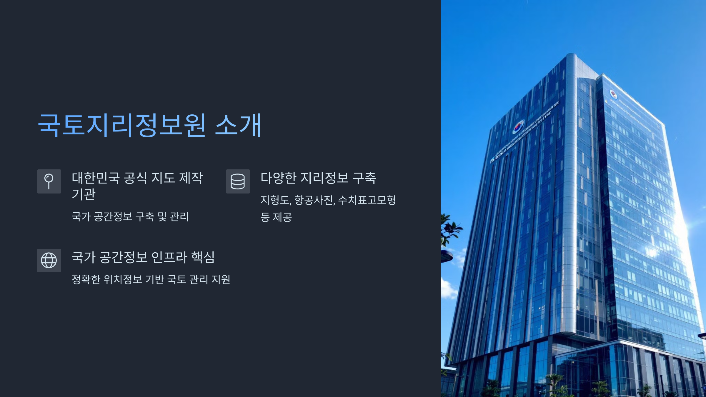 📍 국토지리정보원은 대한민국 국토 전반의 공간 데이터를 수집·가공·관리하는 국가 기관이에요. 지도 제작, 항공사진 촬영, 지형도 발행 등 우리나라의 땅과 관련된 모든 공간정보를 책임지고 있죠.