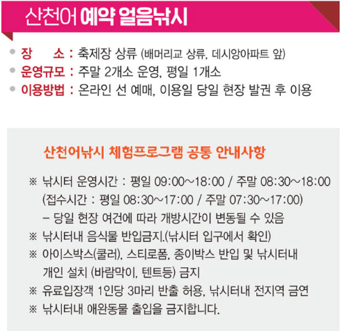 올해는 특히 얼음 낚시 예약 시스템이 더욱 편리하게 개선되었고, 사전 예약으로 미리 시간을 확보할 수 있으니 혼잡을 피하고 싶다면 꼭 예약하시길 추천드려요.
