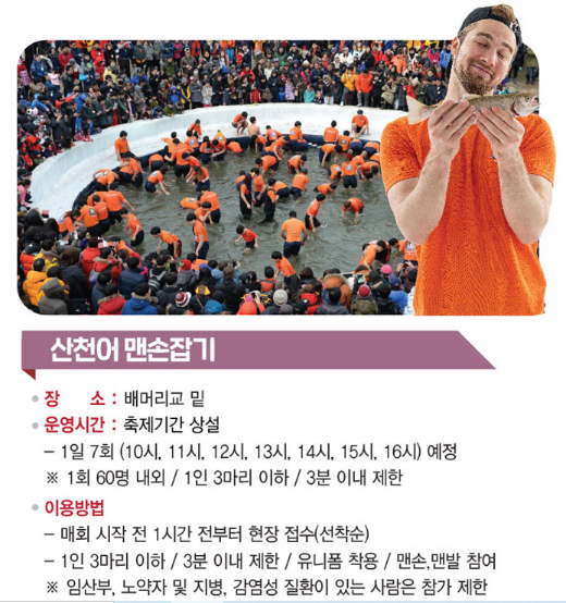 축제장 내의 주요 낚시터와 놀이 구역은 걸어서 이동할 수 있을 정도로 가까워요. 하지만 날씨가 추우니 따뜻하게 입고 방한용품을 챙기는 게 중요해요!