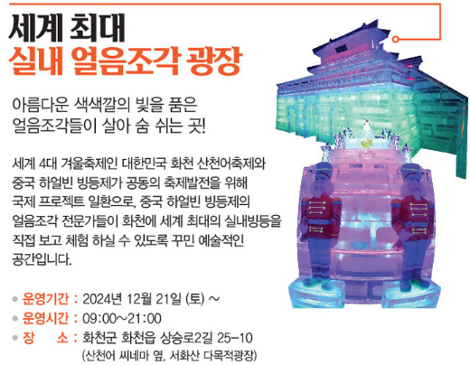 축제에서는 얼음낚시 외에도 눈썰매, 얼음 미끄럼틀, 민속놀이 체험 등 다양한 겨울 액티비티를 즐길 수 있어요. 얼음 위에서의 활동뿐만 아니라 지역 농특산물을 활용한 먹거리 장터도 마련되어 있어 화천의 특별한 맛도 경험할 수 있답니다.