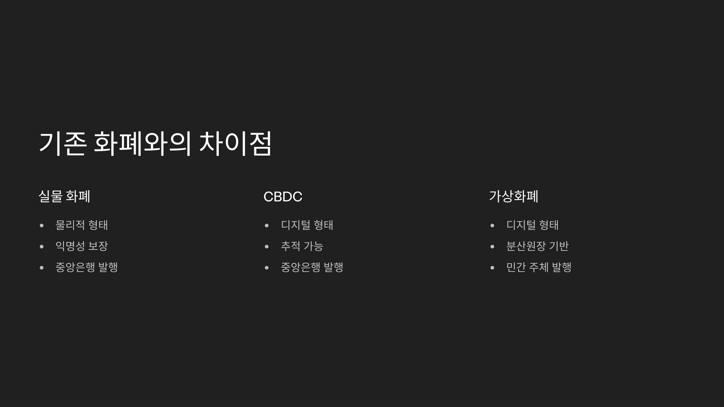 | 항목 | 기존 화폐 | CBDC |