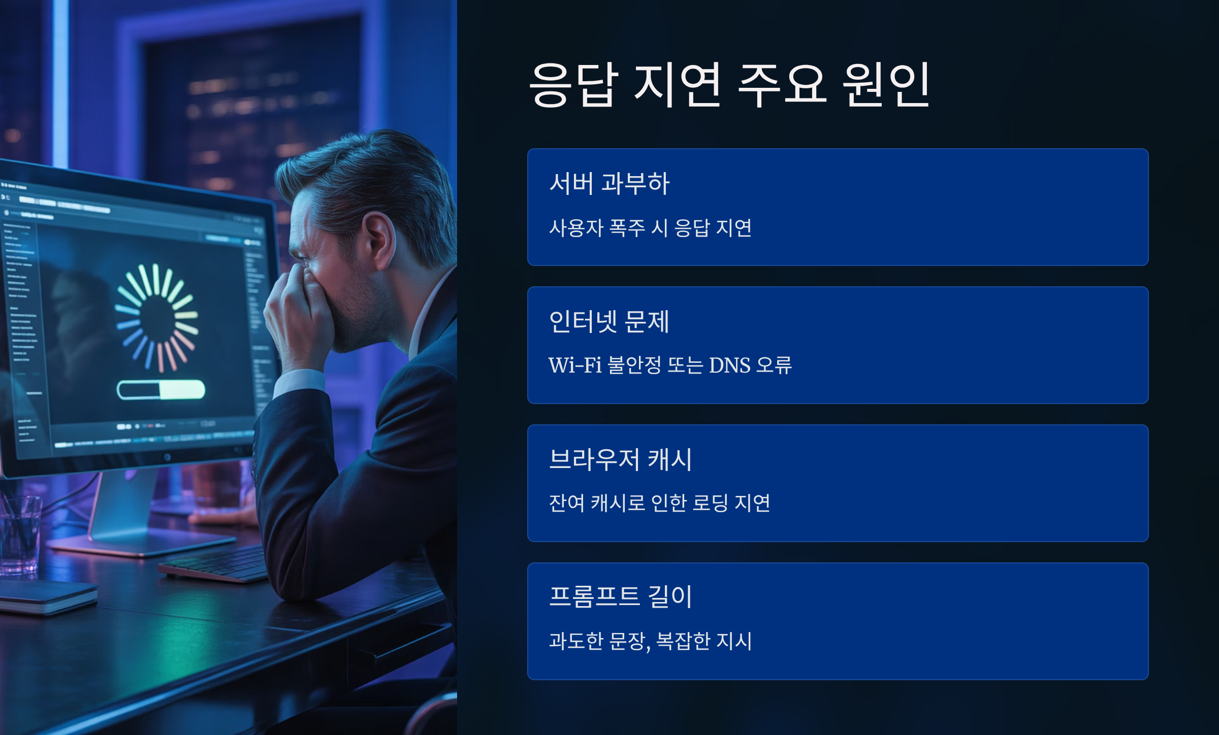 특히 아래처럼 여러 요소가 복합적으로 작용하면 응답 시간이 길어지고, 결과가 멈춘 것처럼 느껴질 수 있답니다.